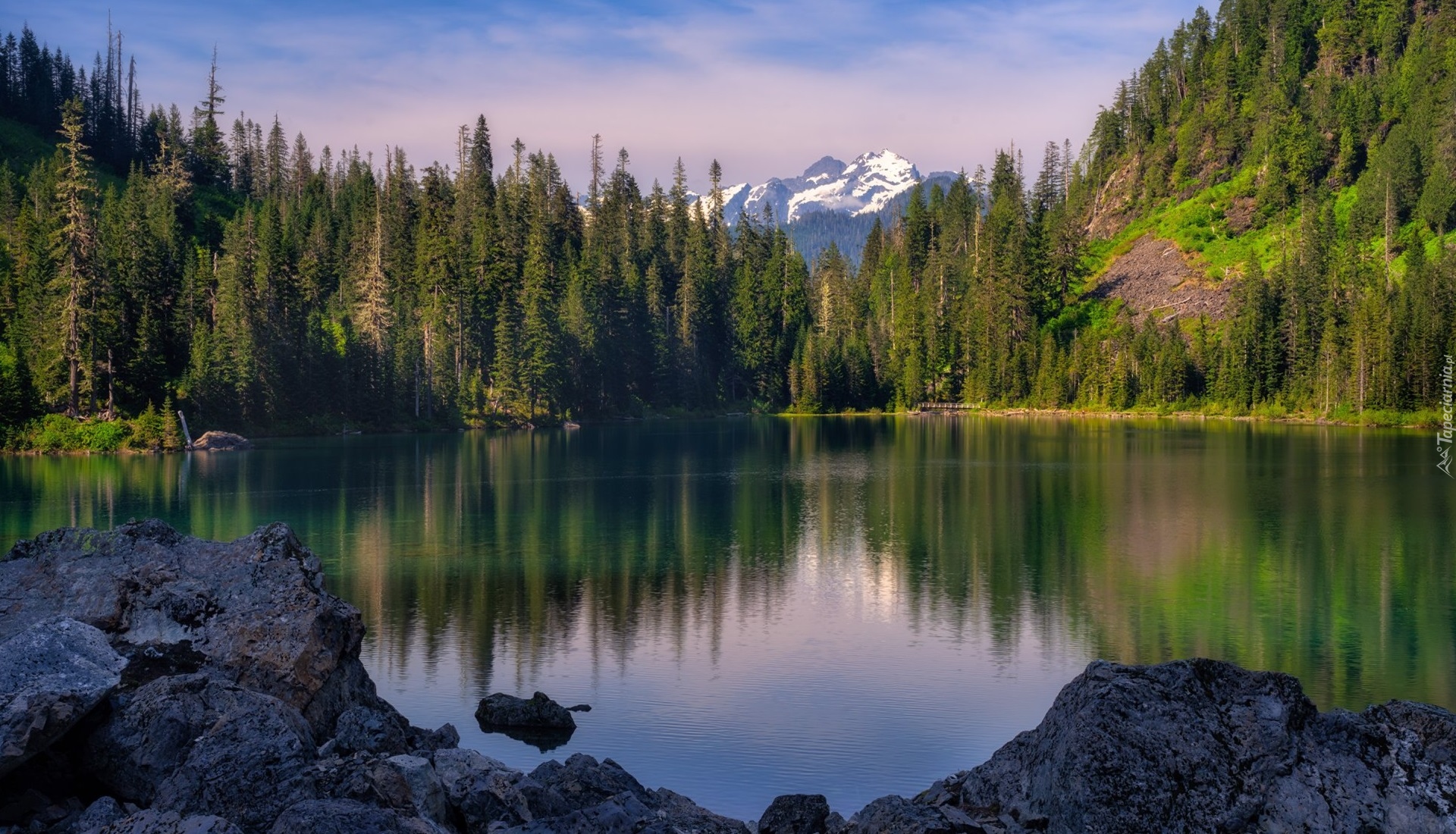 Edytor tapety: Kamienie i drzewa nad brzegiem jeziora