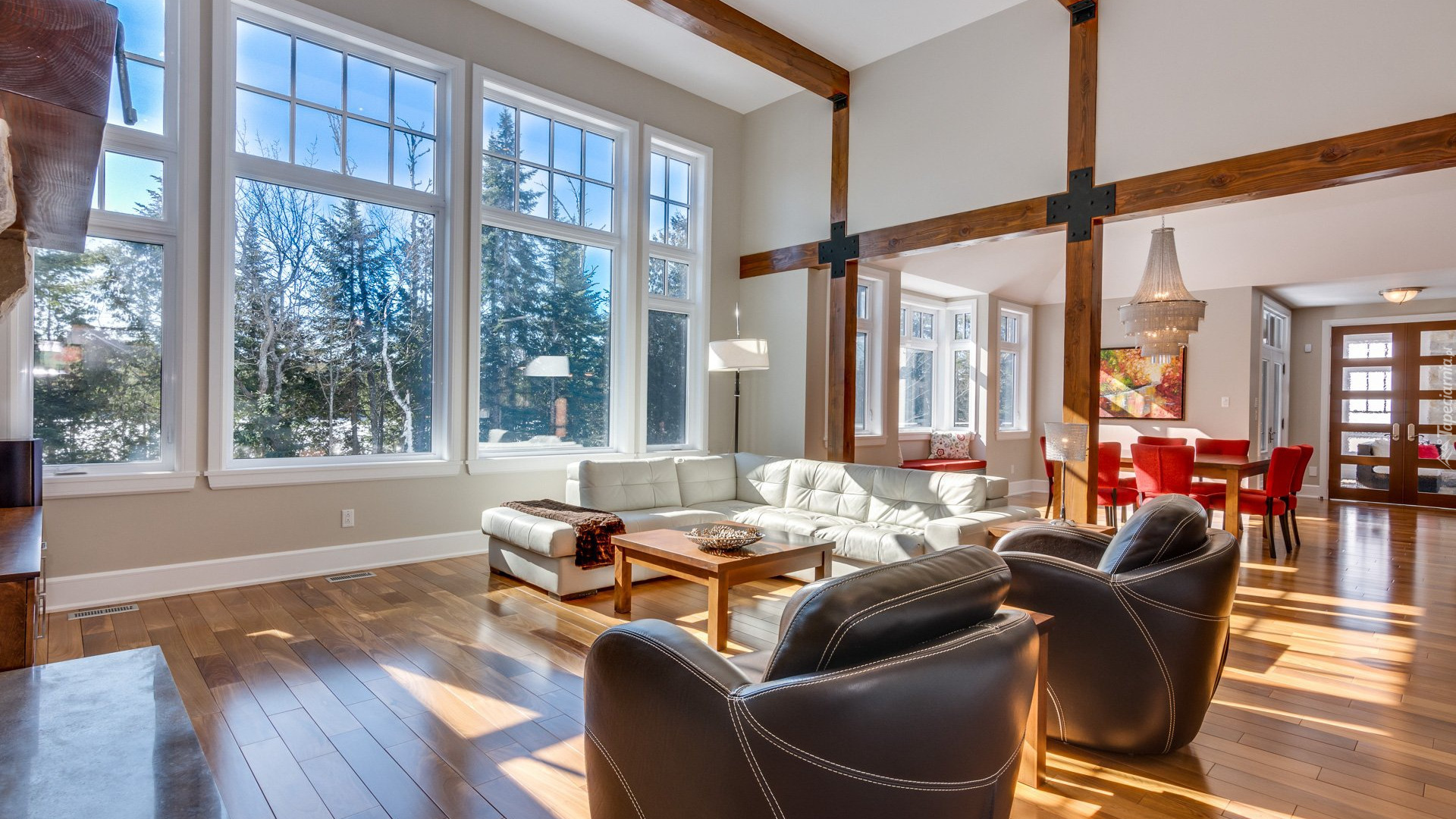 Edytor tapety: Wnętrze umeblowanego pokoju z dużymi oknami