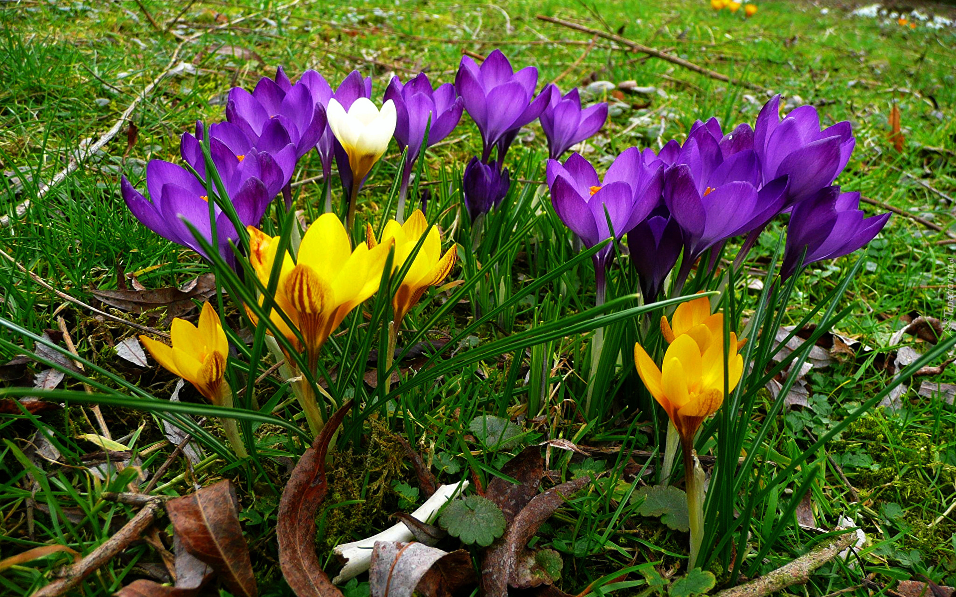 Edytor tapety: Kępka kolorowych krokusów w trawie