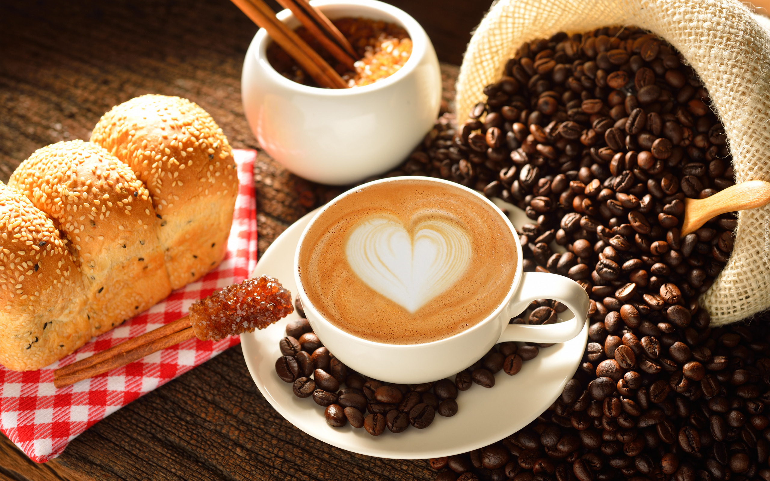 Edytor tapety: Kawa w filiżance obok ziaren i bułki