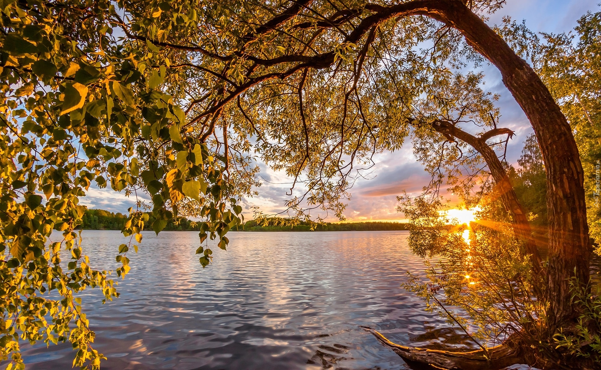Edytor tapety: Pochylone drzewa nad jeziorem o wschodzie słońca