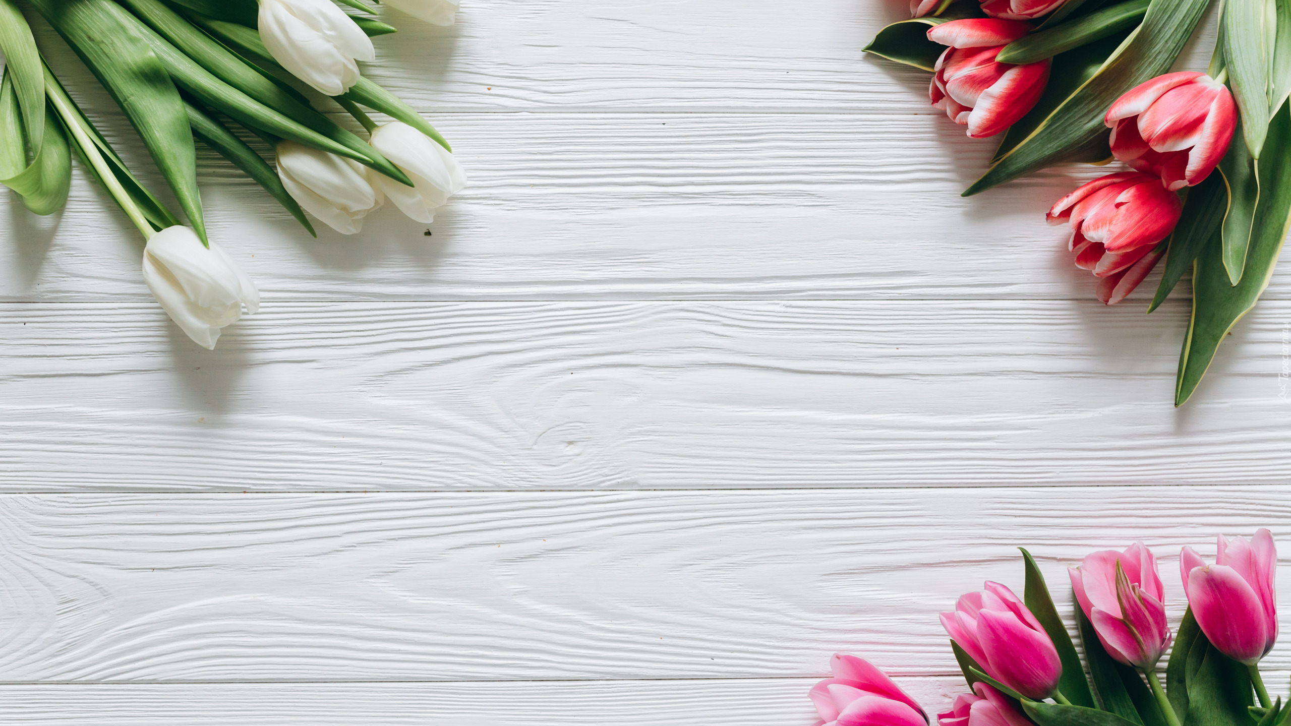 Edytor tapety: Kolorowe tulipany na białych deskach