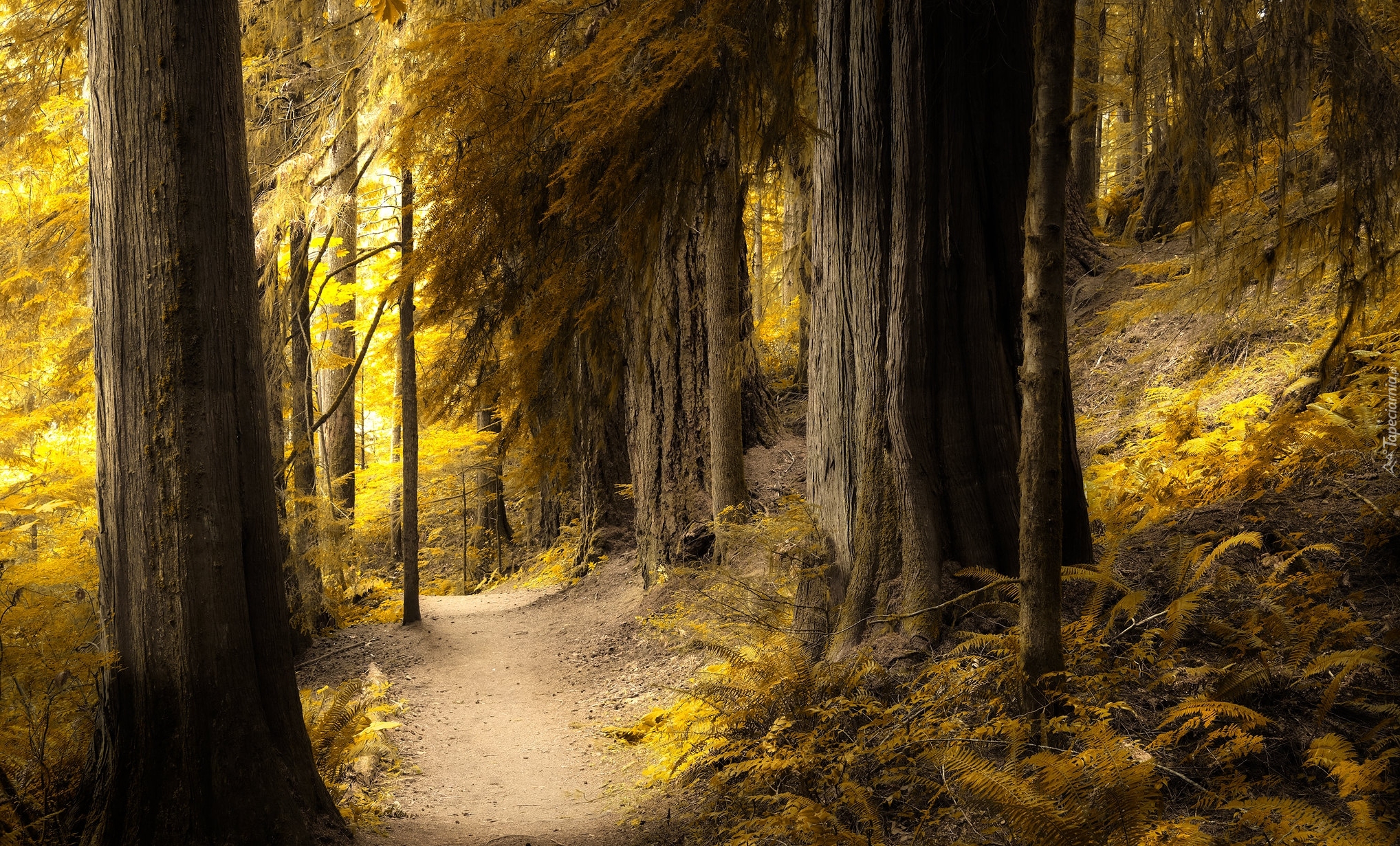 Edytor tapety: Jesienne drzewa i paprocie przy leśnej drodze