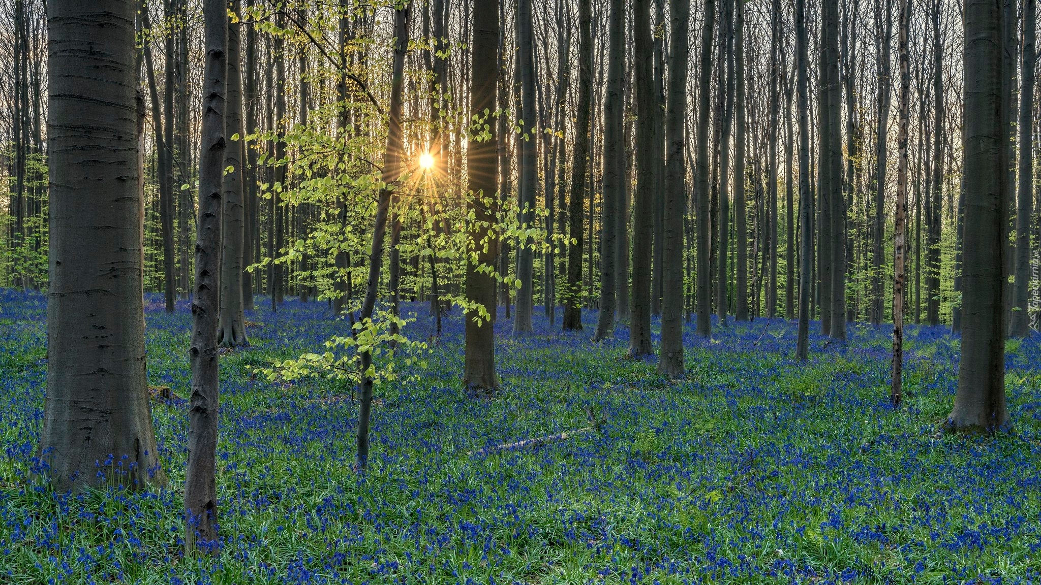 Edytor tapety: Niebieskie kwiaty i drzewa w promieniach słońca