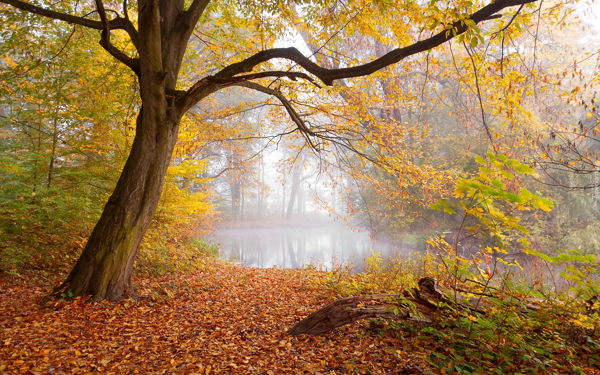 Edytor tapety: Jesienne drzewa nad zamglonym stawem