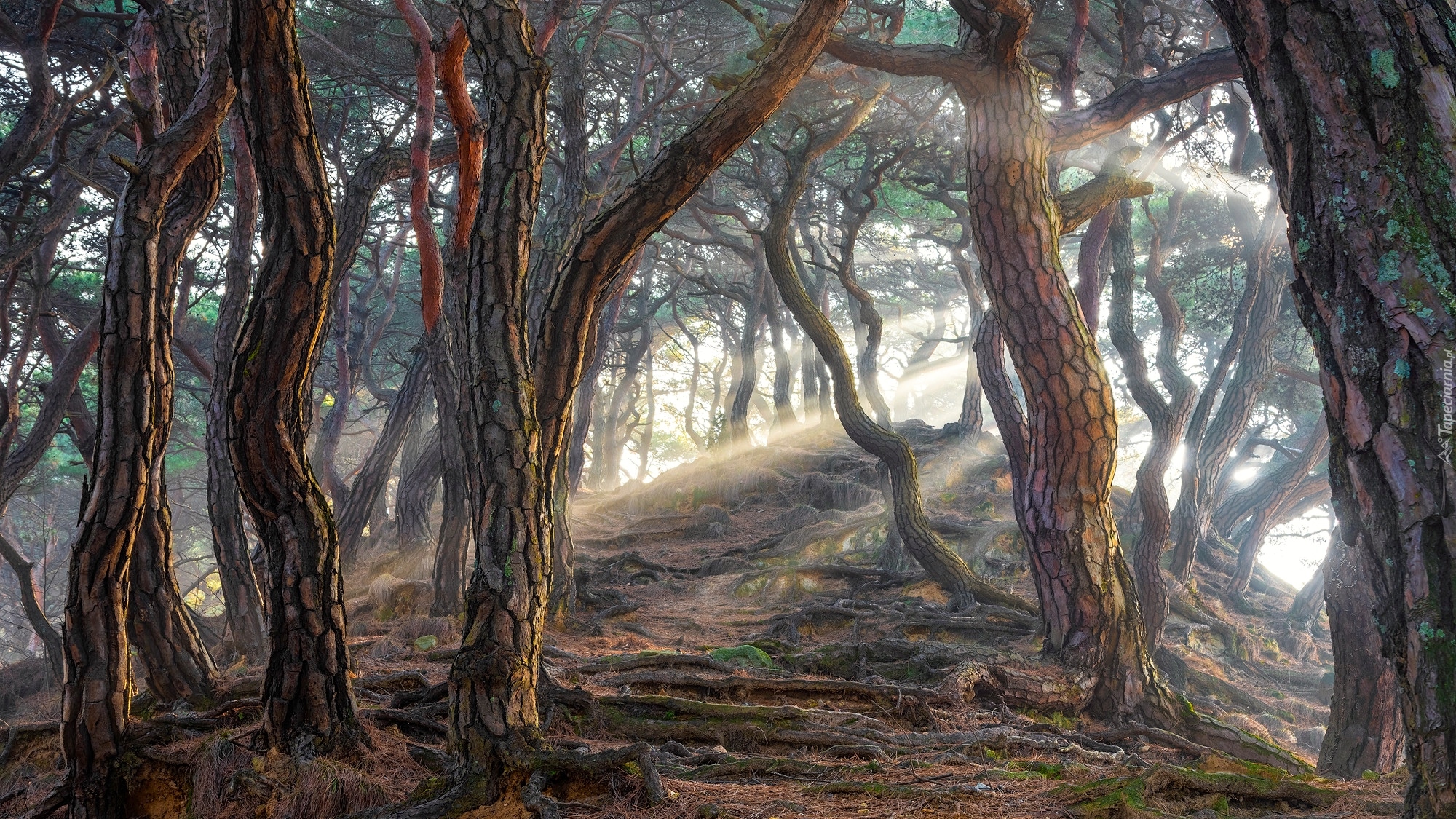 Edytor tapety: Światło słoneczne między drzewami na wzgórzu