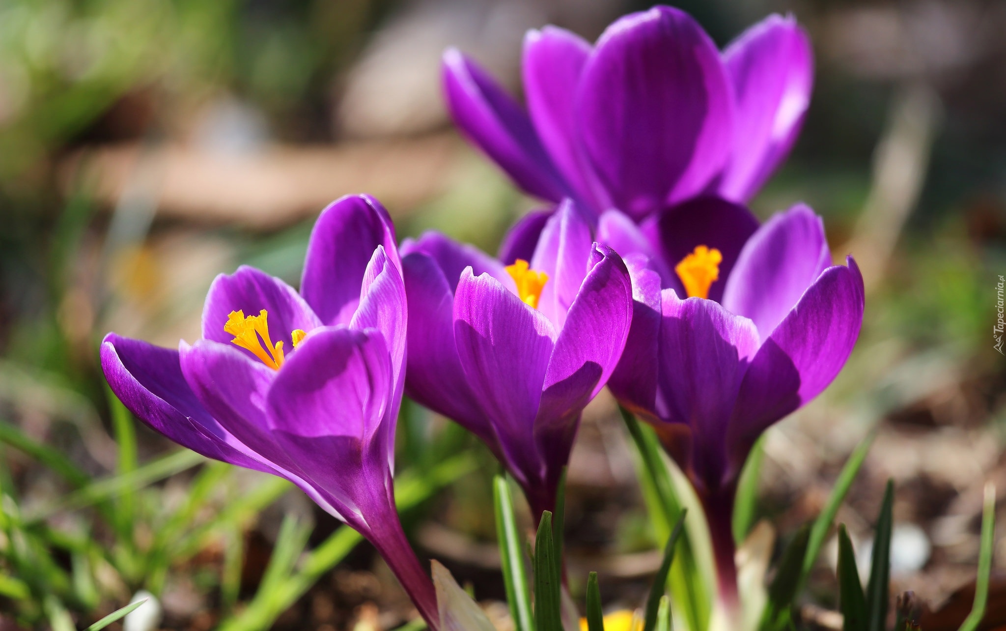 Edytor tapety: Fioletowe krokusy z pręcikami w trawie