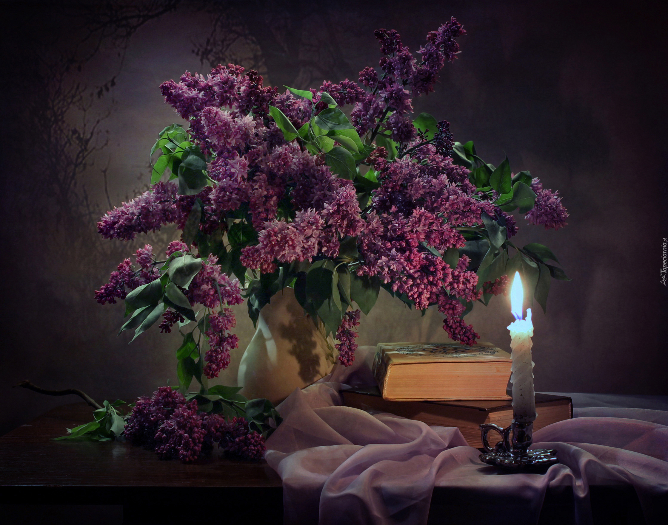 Edytor tapety: Świeca obok wazonu z bzem