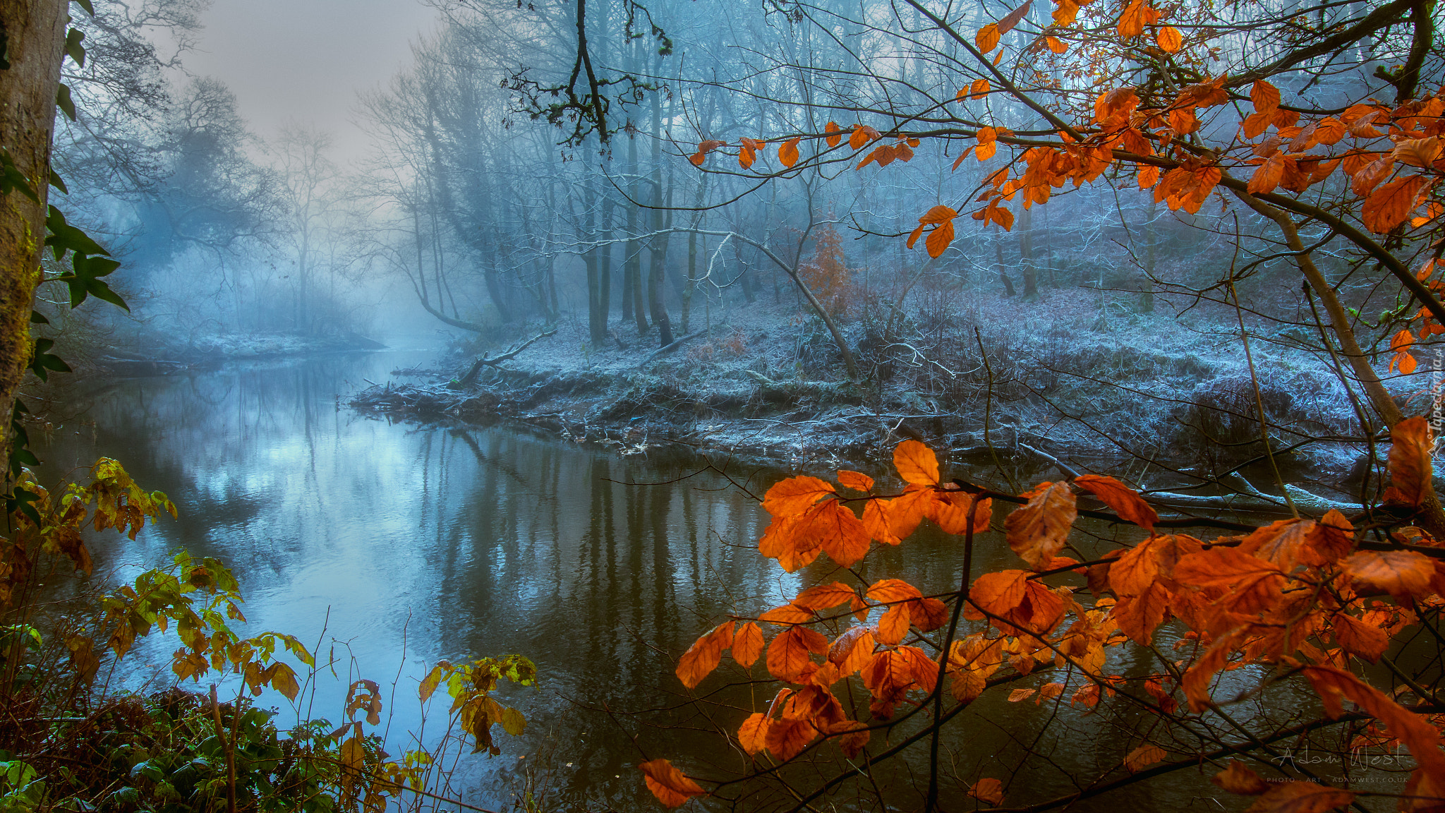 Edytor tapety: Mgła nad rzeką w oszronionym lesie