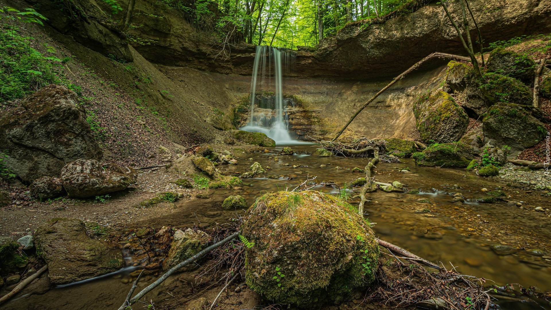 Edytor tapety: Mały wodospad na skale w zielonym lesie