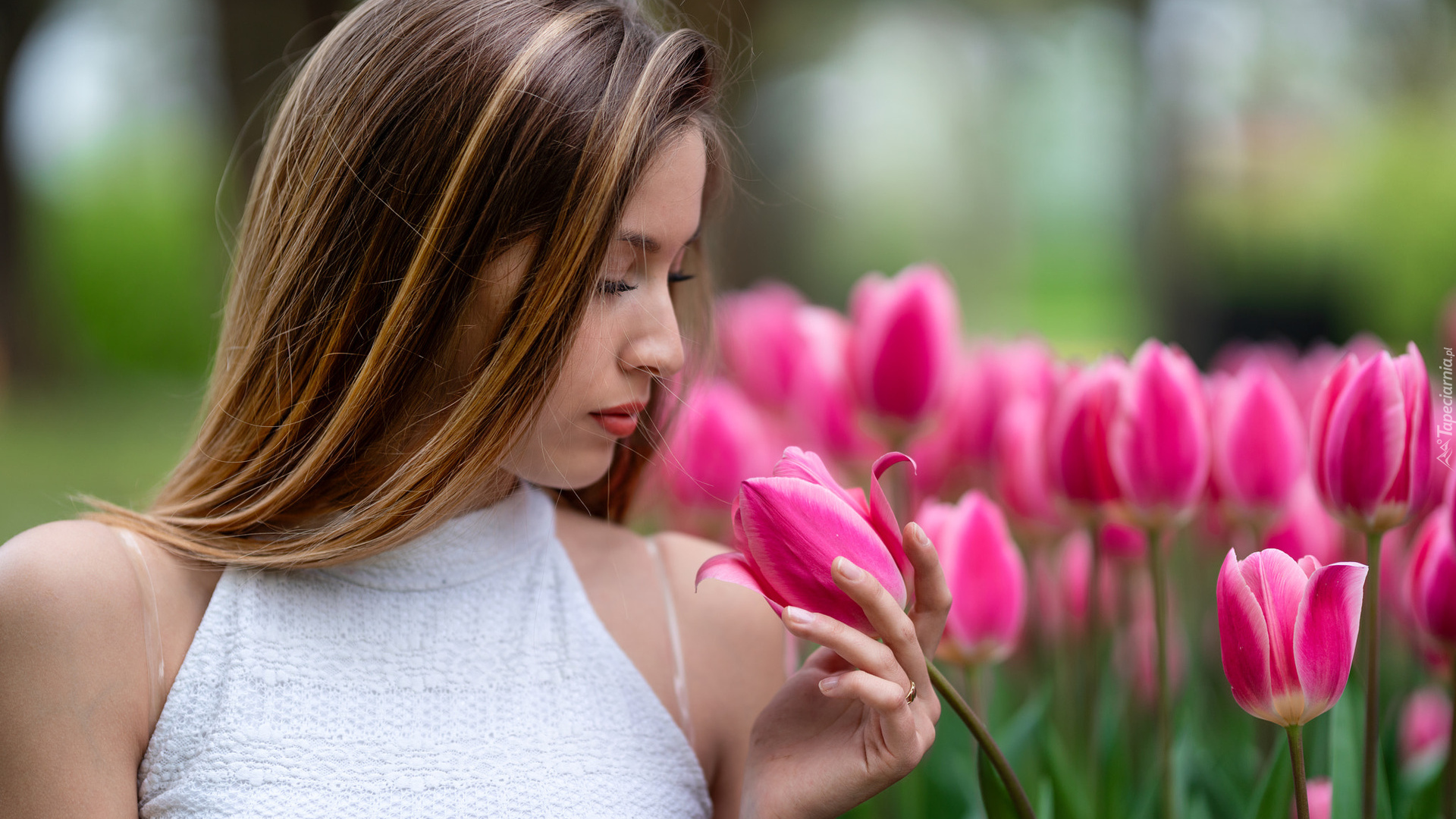 Edytor tapety: Kobieta obok kwitnących tulipanów