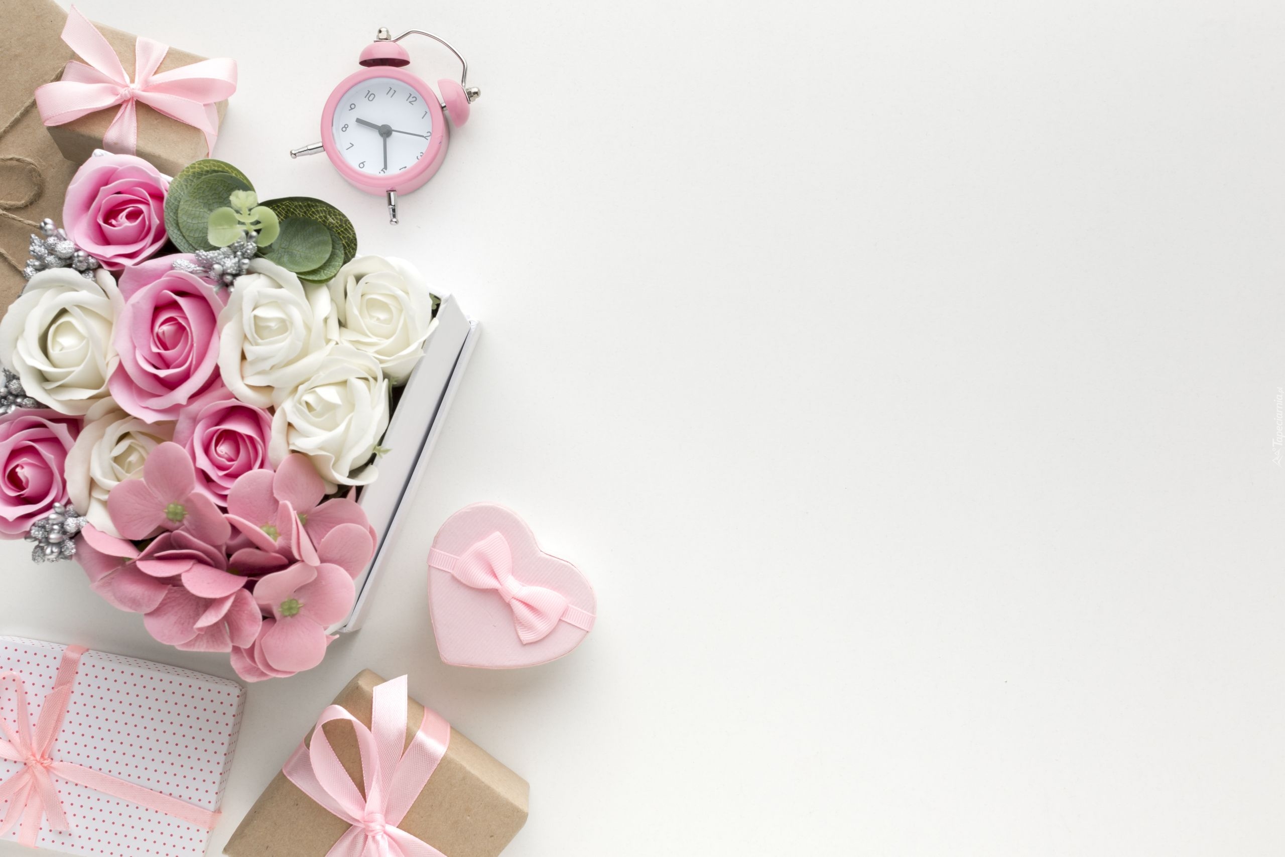Edytor tapety: Róże w pudełku obok budzika i prezentów