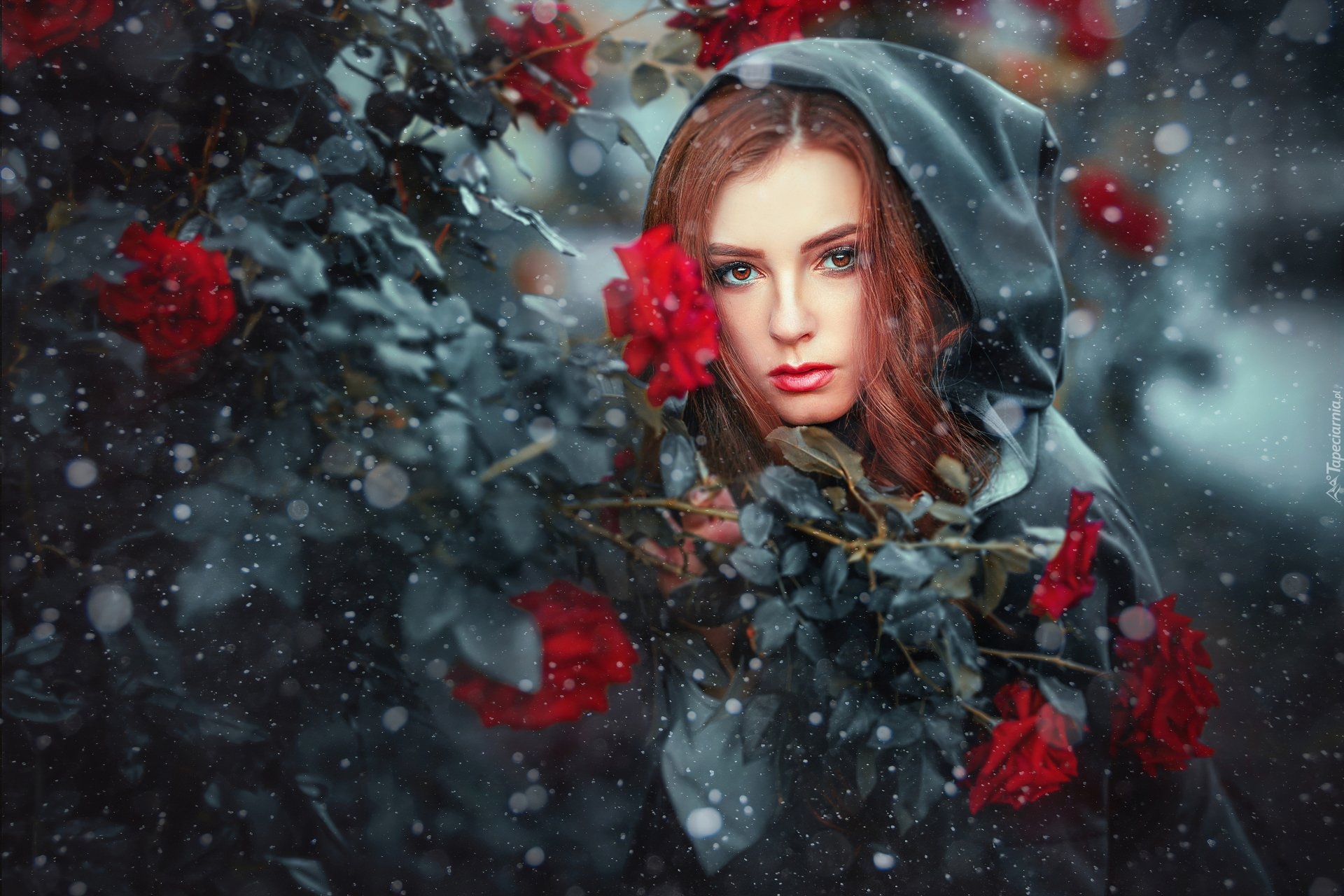Edytor tapety: Rudowłosa kobieta w kapturze przy krzewie róży