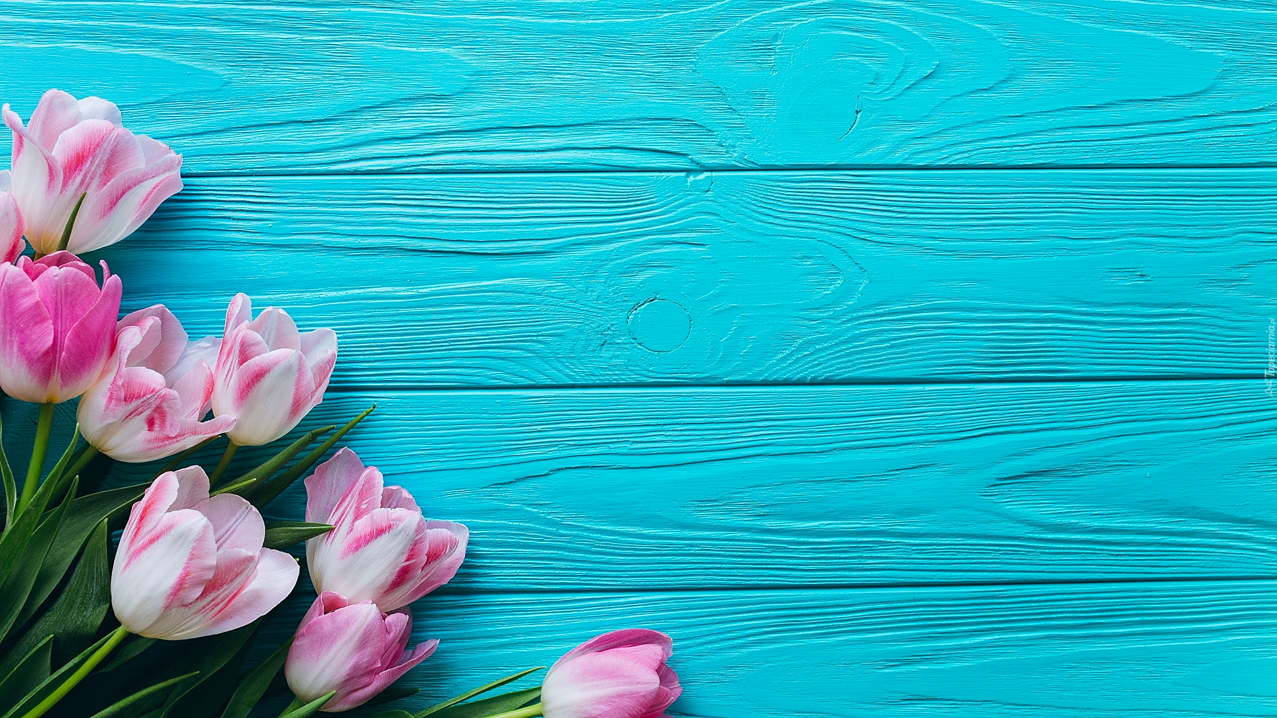 Edytor tapety: Różowo-białe tulipany na niebieskich deskach