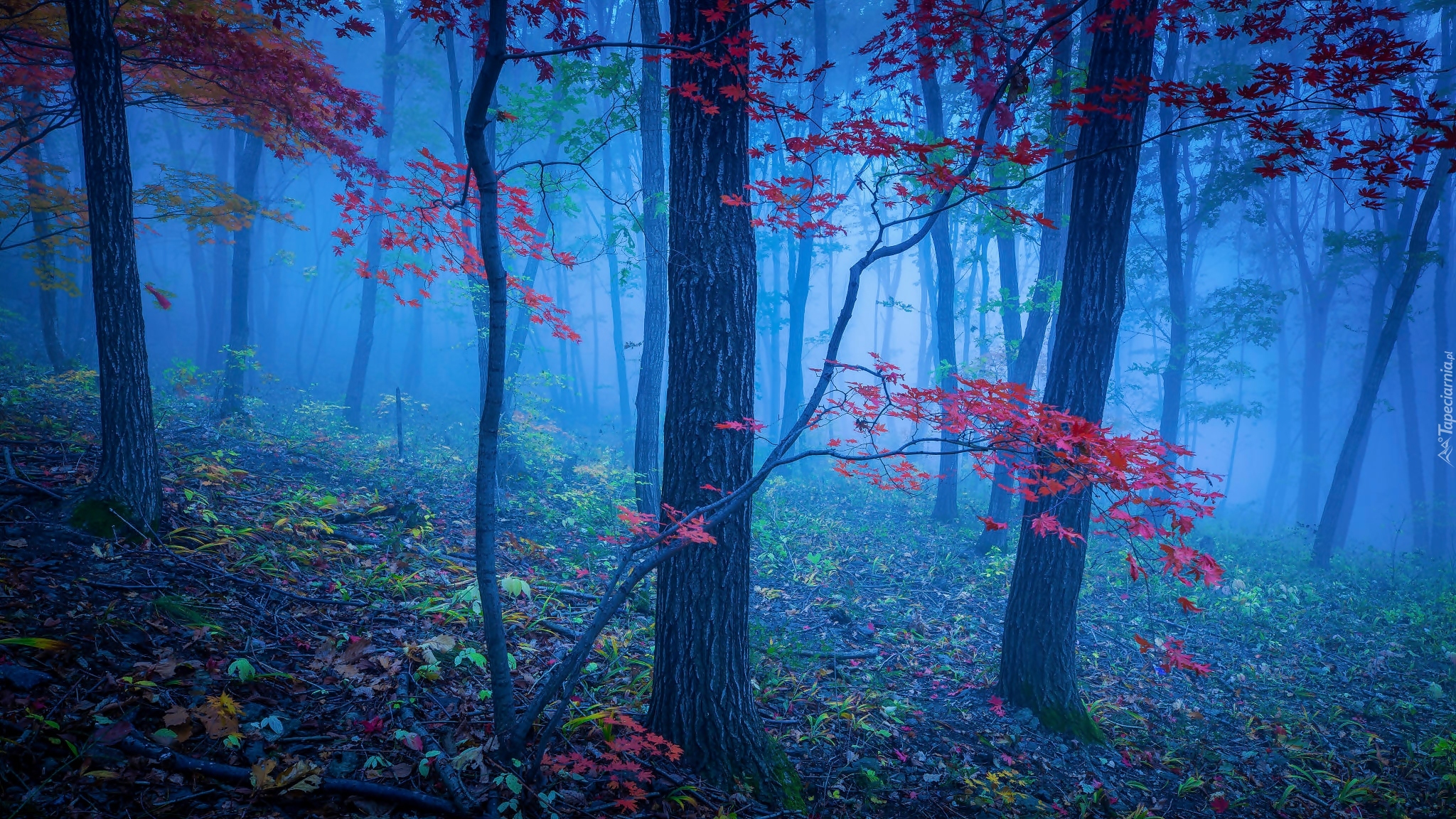 Edytor tapety: Drzewo z czerwonymi liśćmi na tle zamglonego lasu