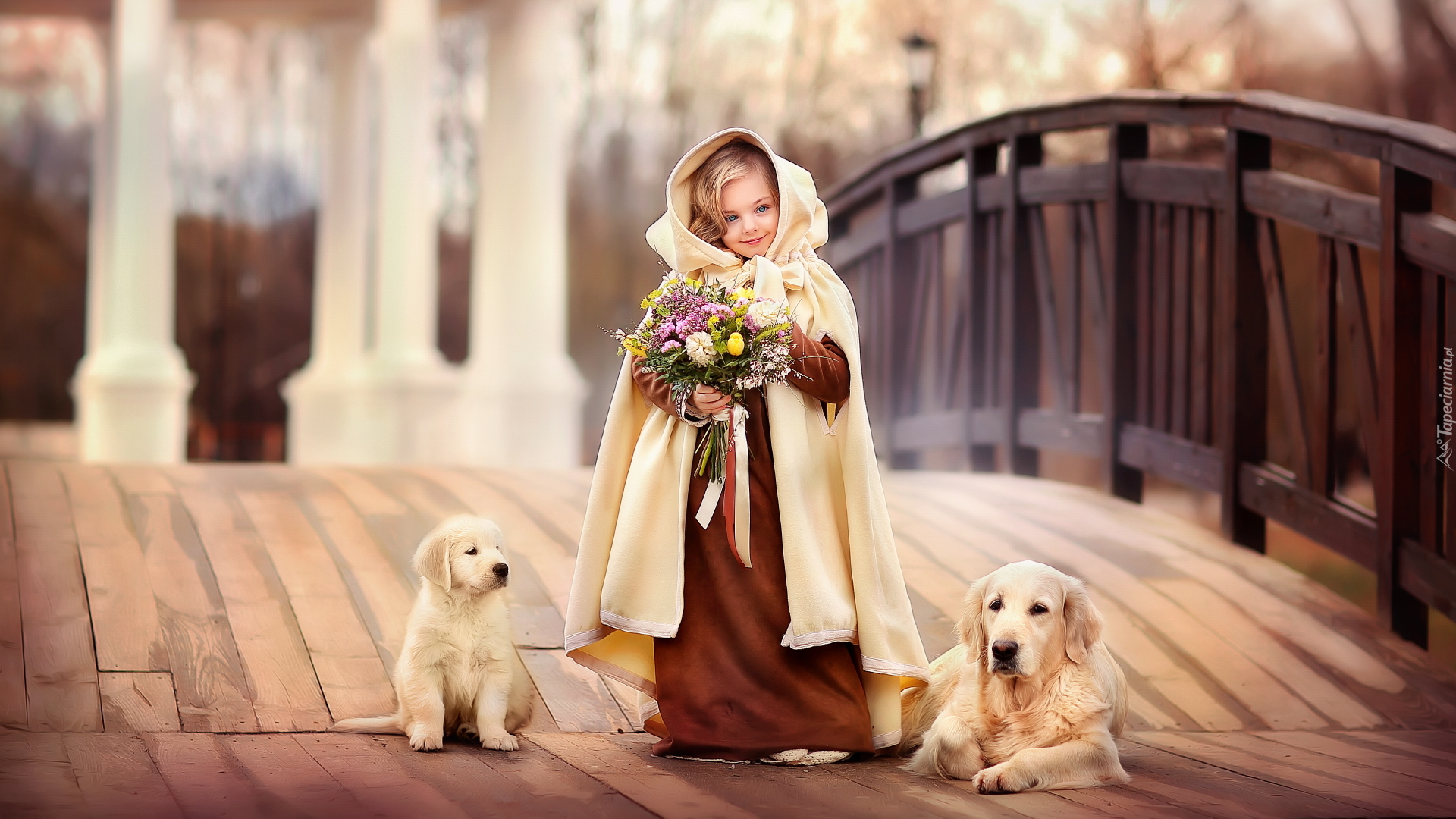 Edytor tapety: Dziewczynka z psami golden retrievera