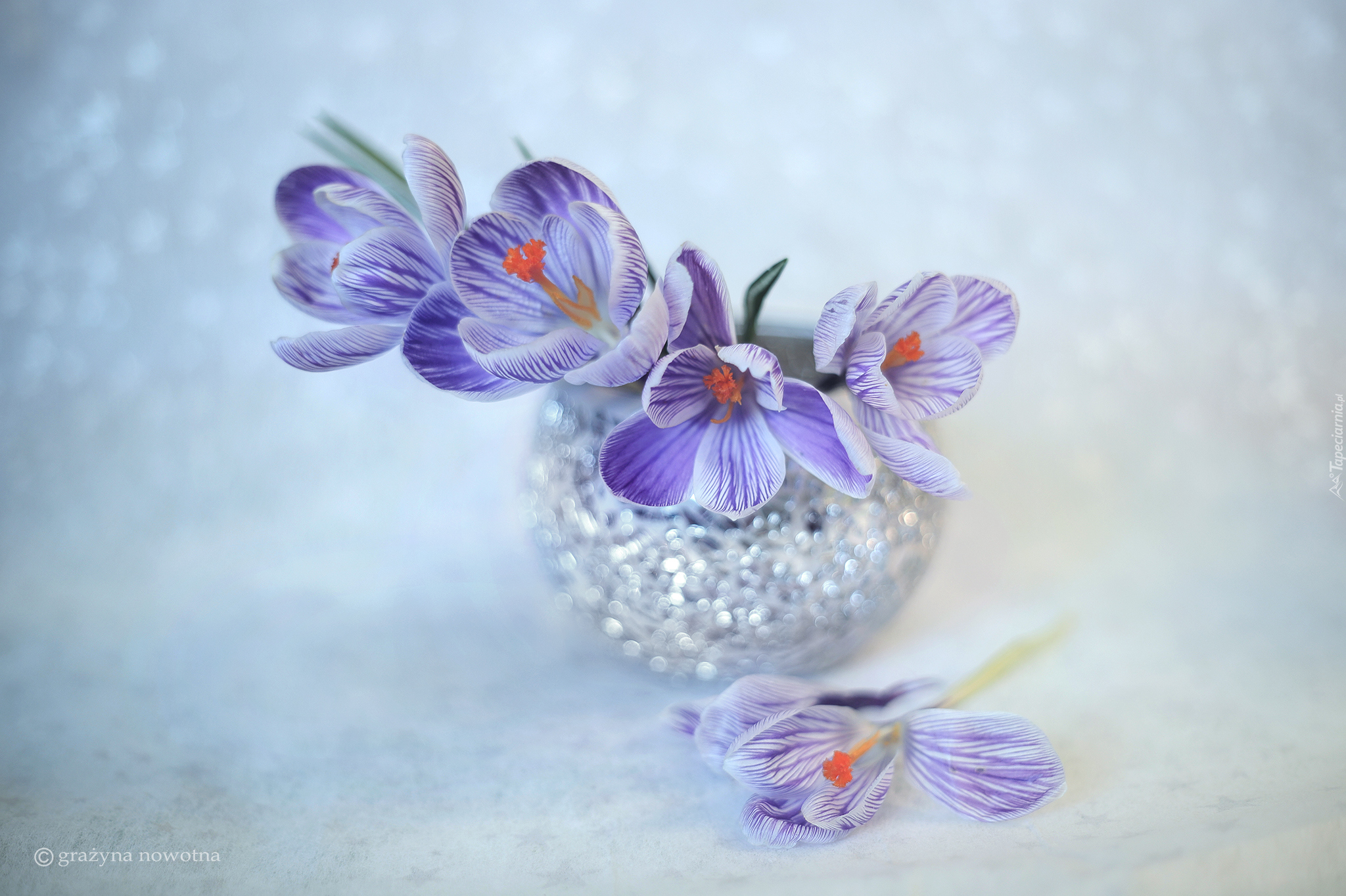 Edytor tapety: Fioletowo-białe krokusy w wazoniku