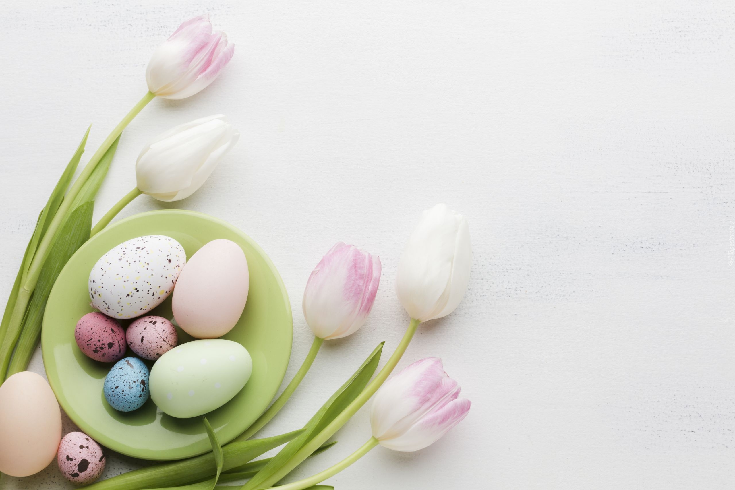 Edytor tapety: Pisanki na talerzu pośród tulipanów