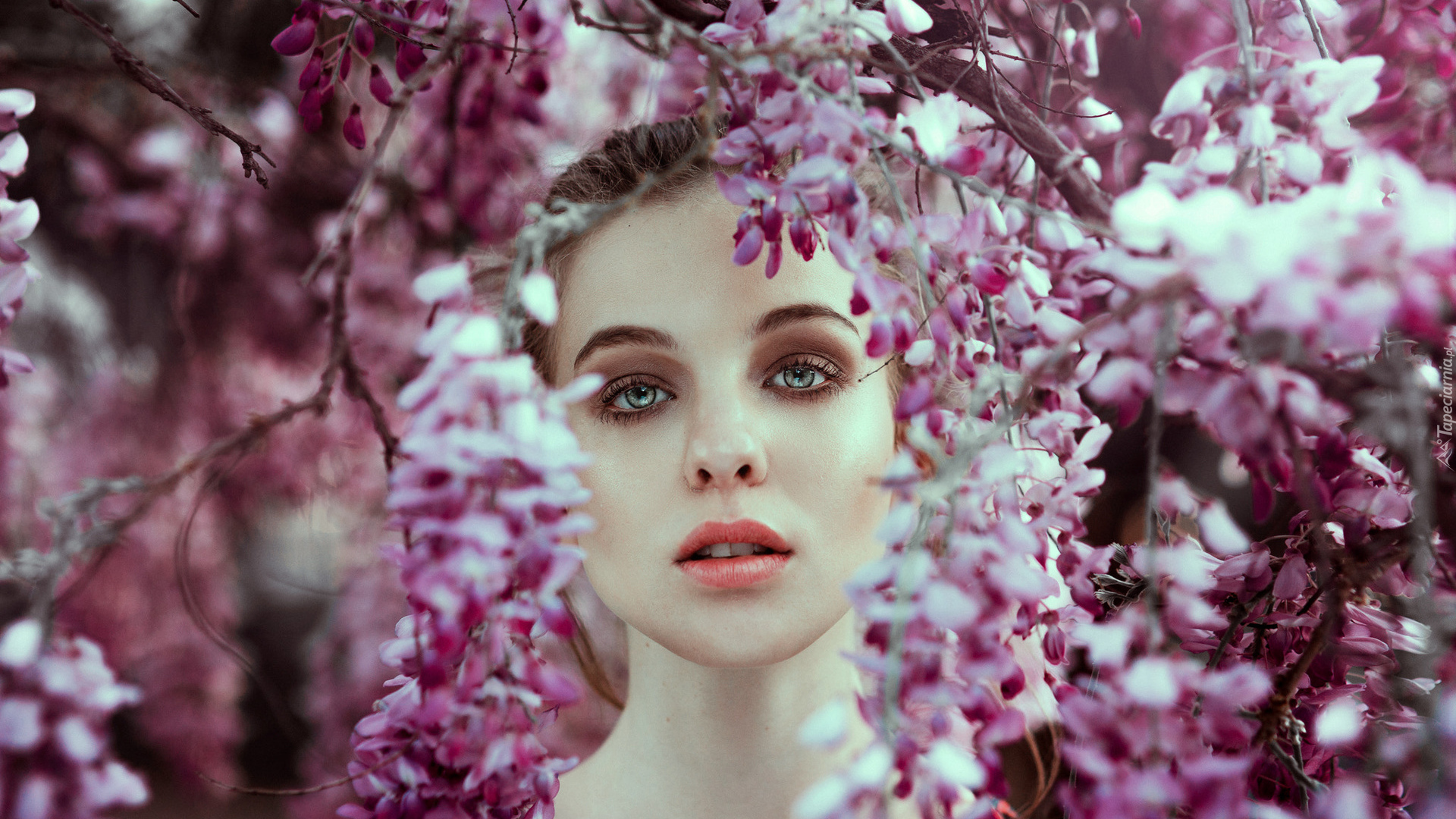 Edytor tapety: Kobieta wśród gałązek kwitnącego drzewa