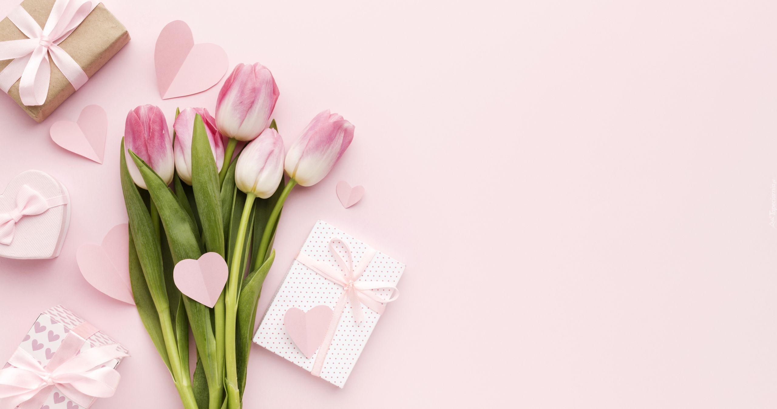 Edytor tapety: Prezenty i tulipany na różowym tle