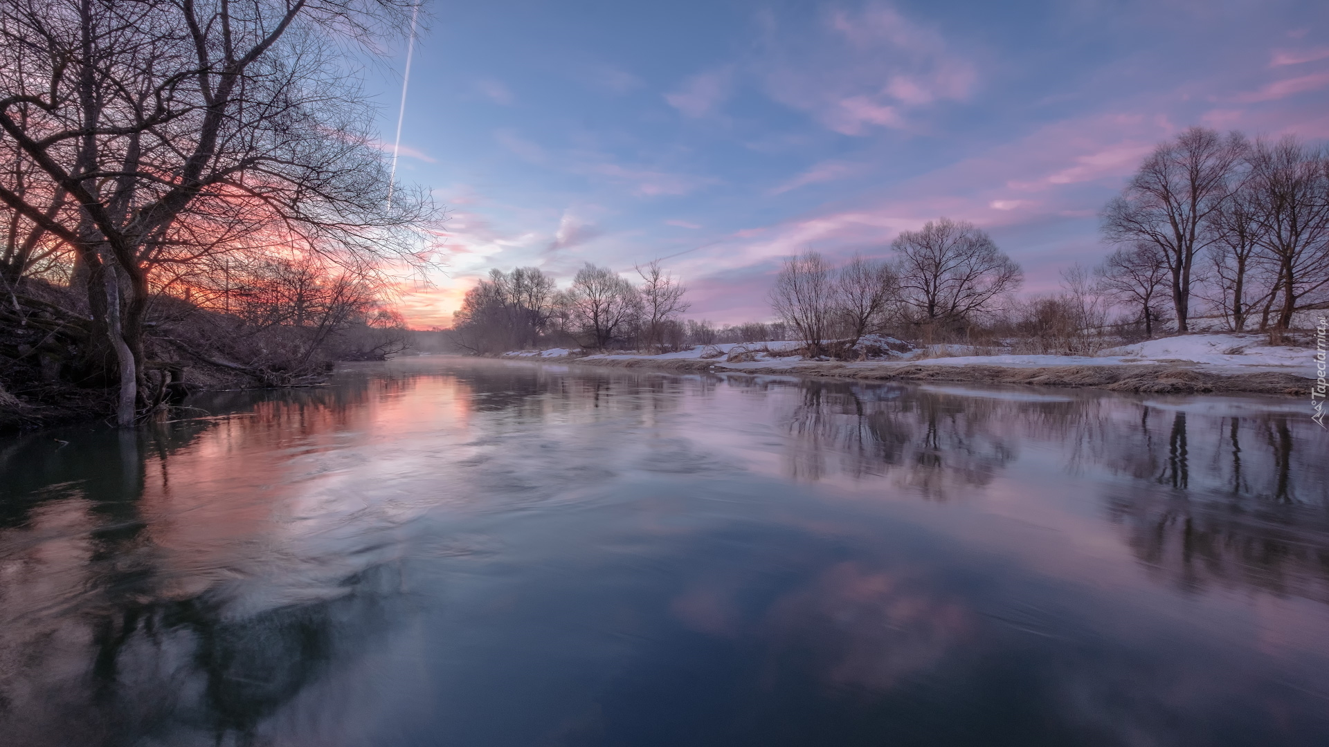 Edytor tapety: Bezlistne drzewa na brzegach rzeki