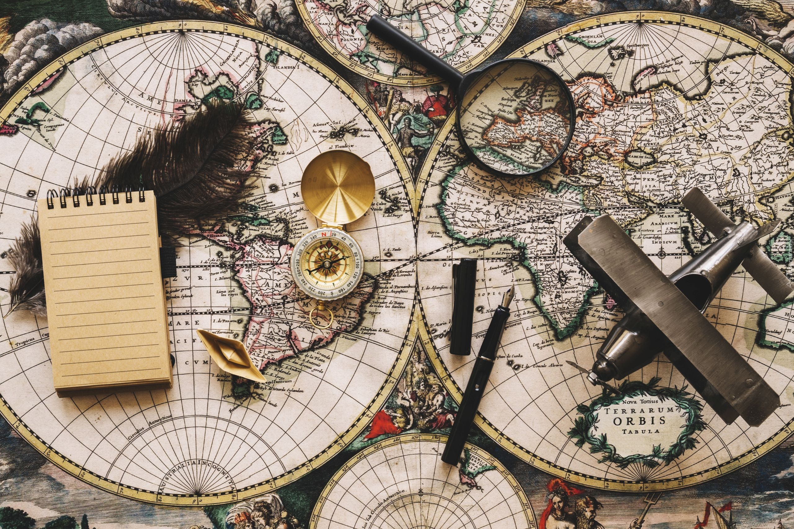 Edytor tapety: Notatnik obok kompasu i lupy na mapie