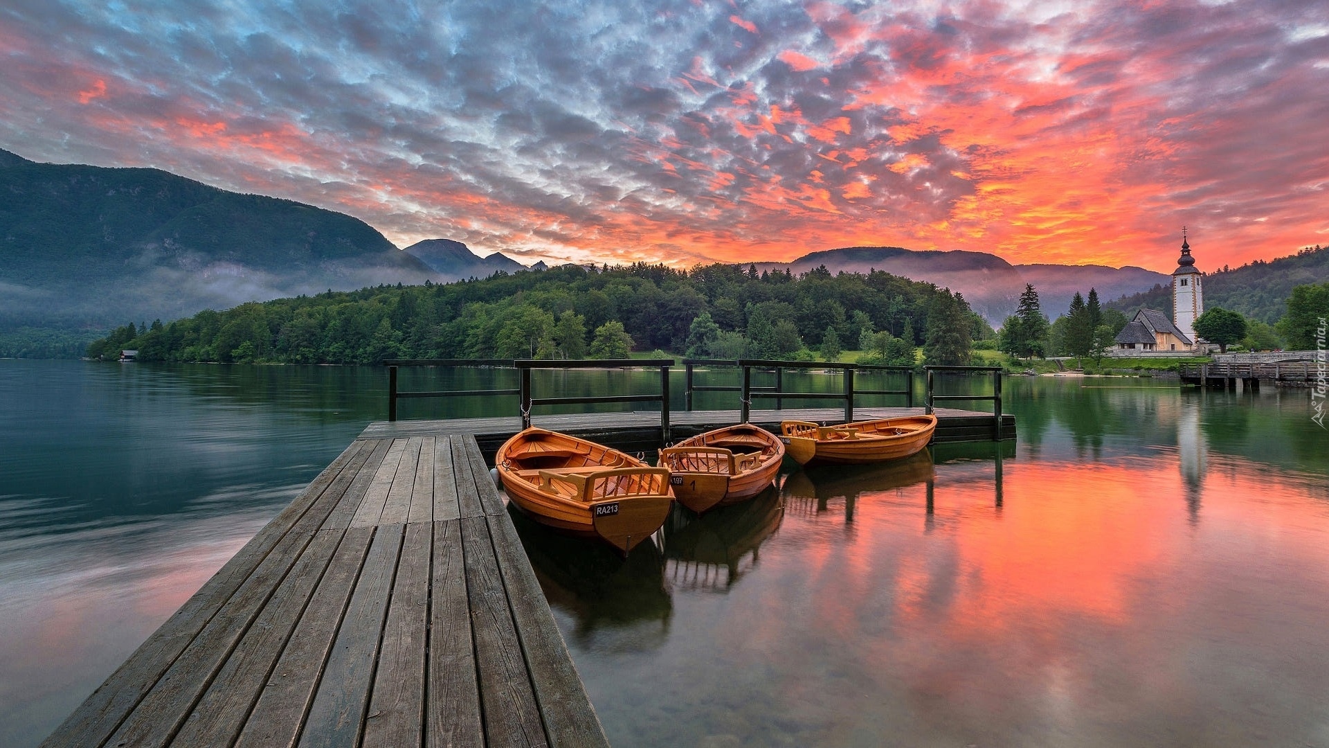 Edytor tapety: Łódki przy pomoście na jeziorze Bohinj w Słowenii