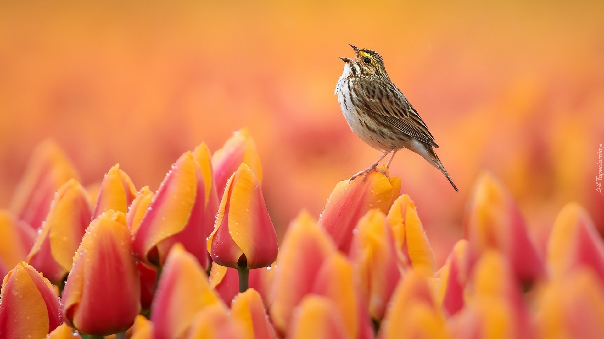 Edytor tapety: Bagiennik żółtobrewy na pomarańczowych tulipanach