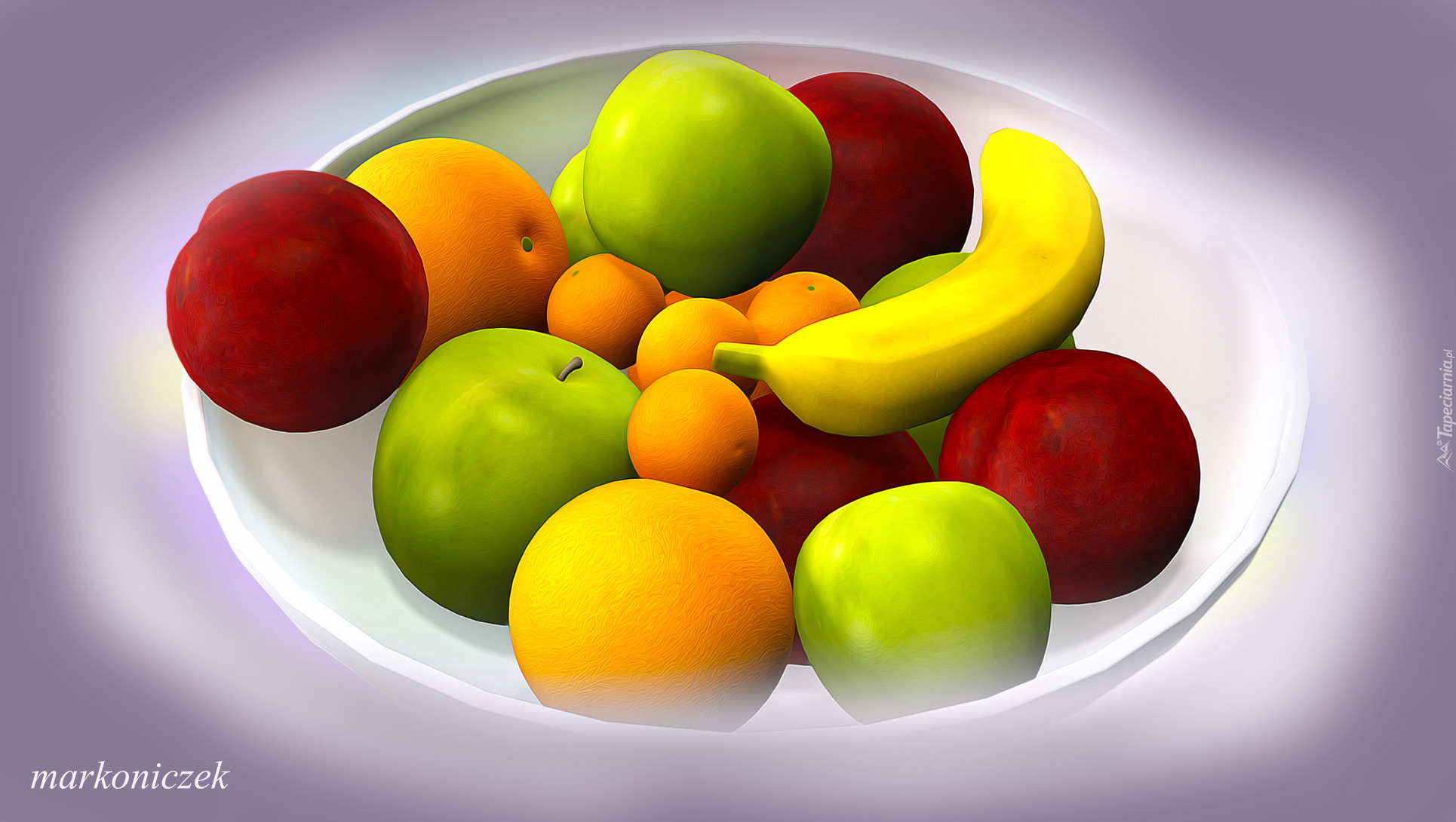 Edytor tapety: Banany jabłka i pomarańcze na talerzu