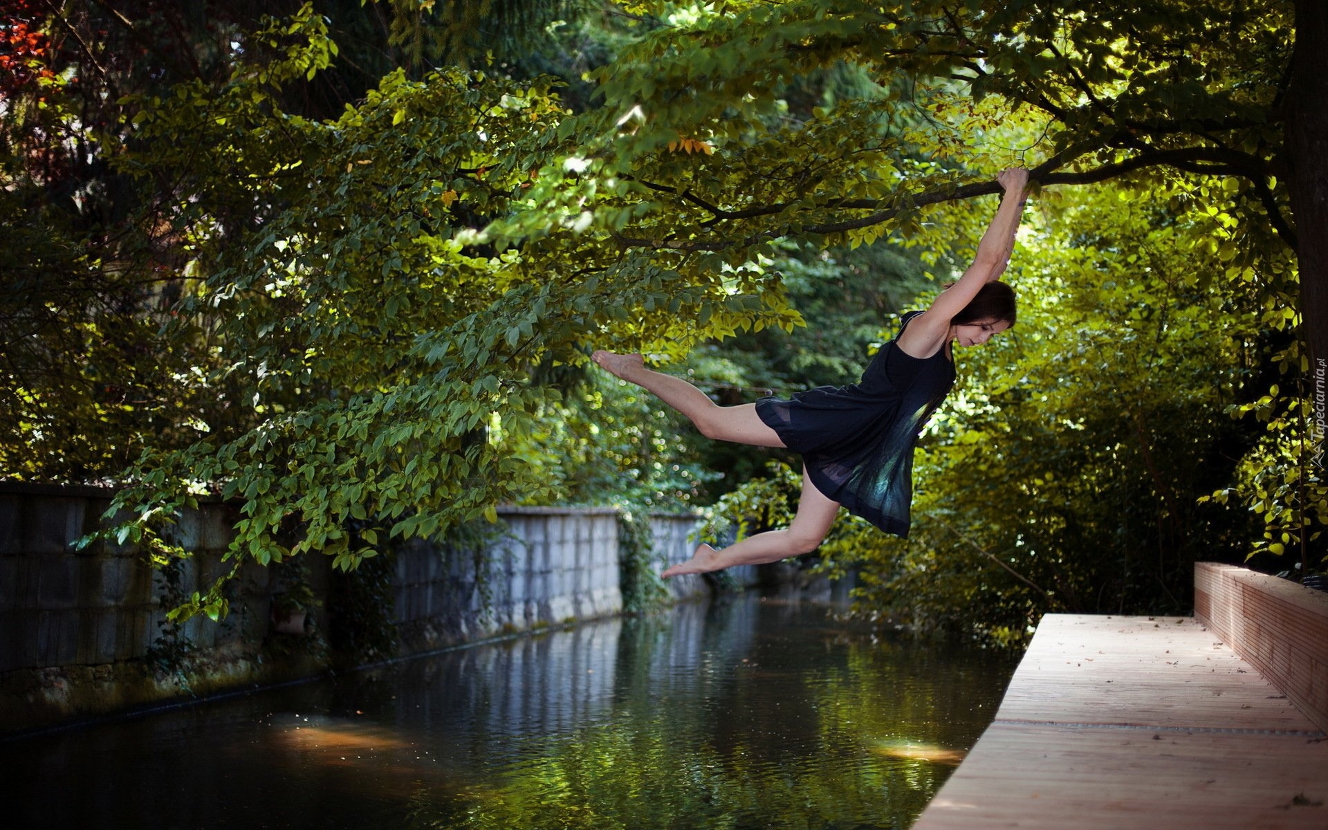 Edytor tapety: Dziewczyna zwisająca z gałęzi drzewa
