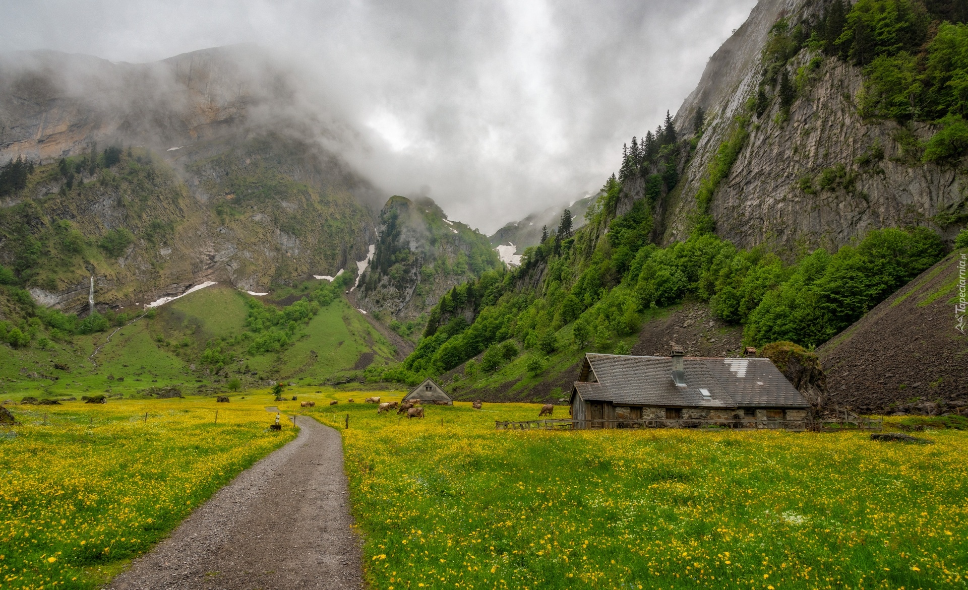 Edytor tapety: Domy i krowy na łące w górskiej dolinie