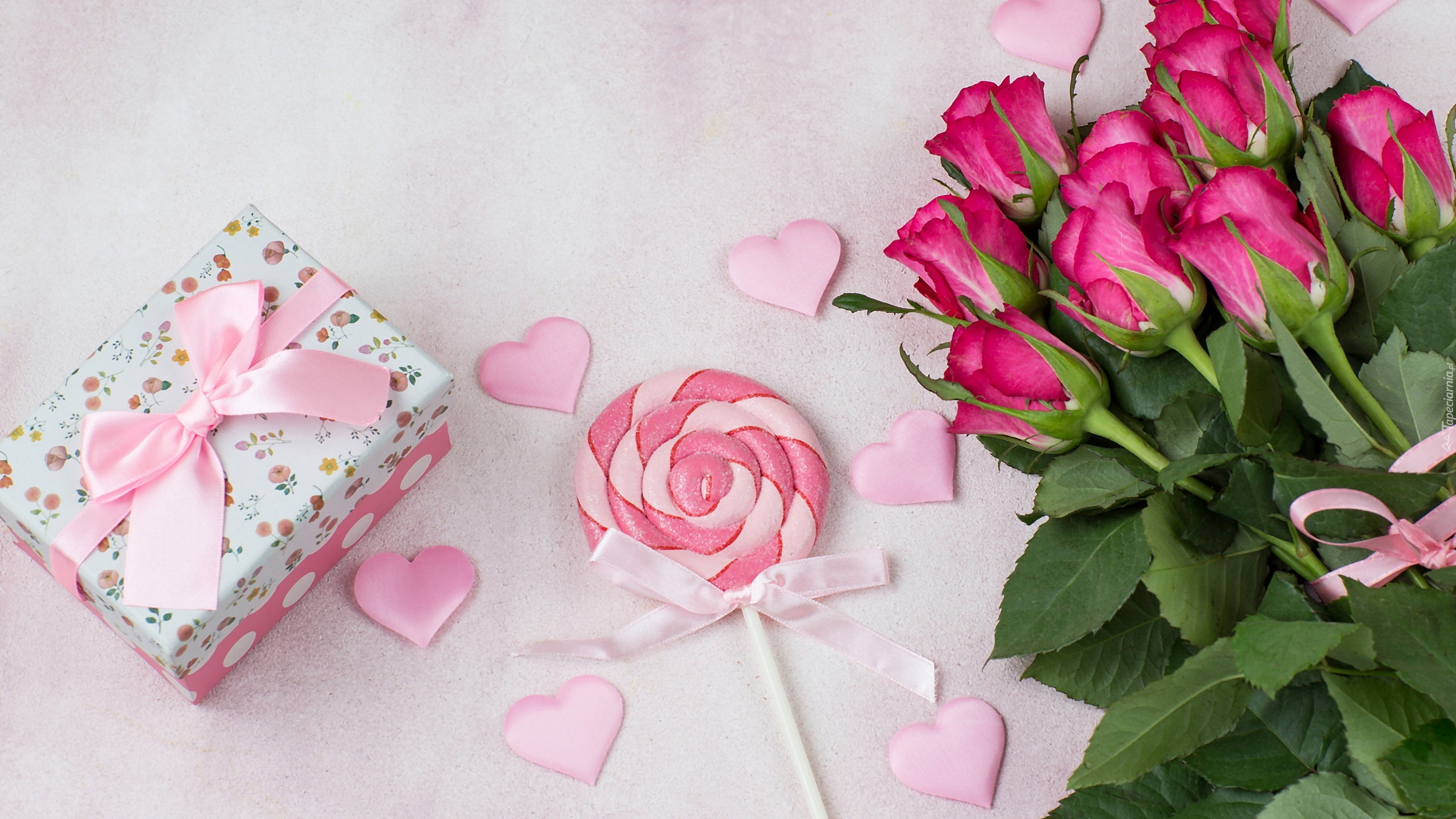 Edytor tapety: Prezent i lizak obok bukietu róż
