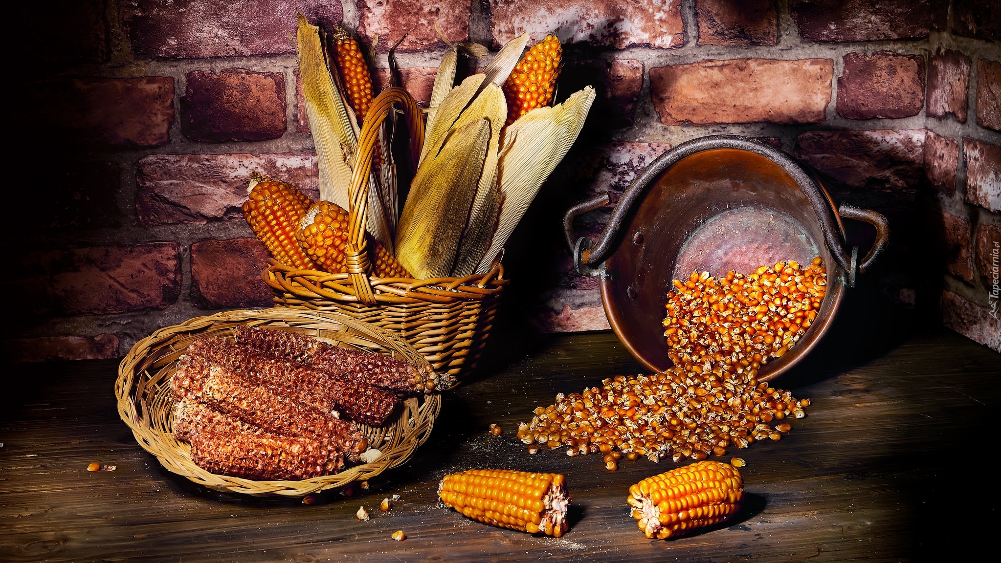 Edytor tapety: Kolby i ziarna kukurydzy w garnku i koszyku