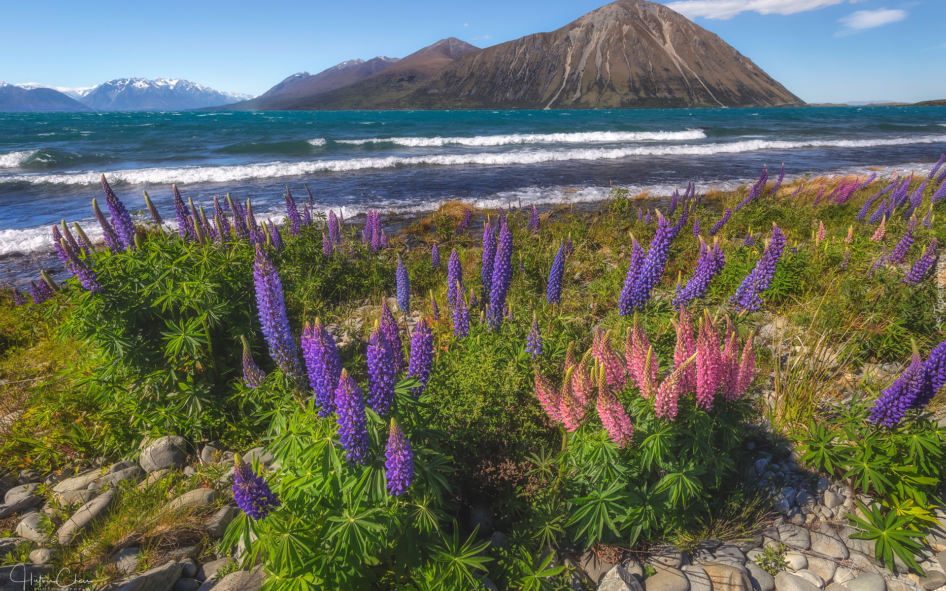Edytor tapety: Łubin na brzegu jeziora Ohau w Nowej Zelandii
