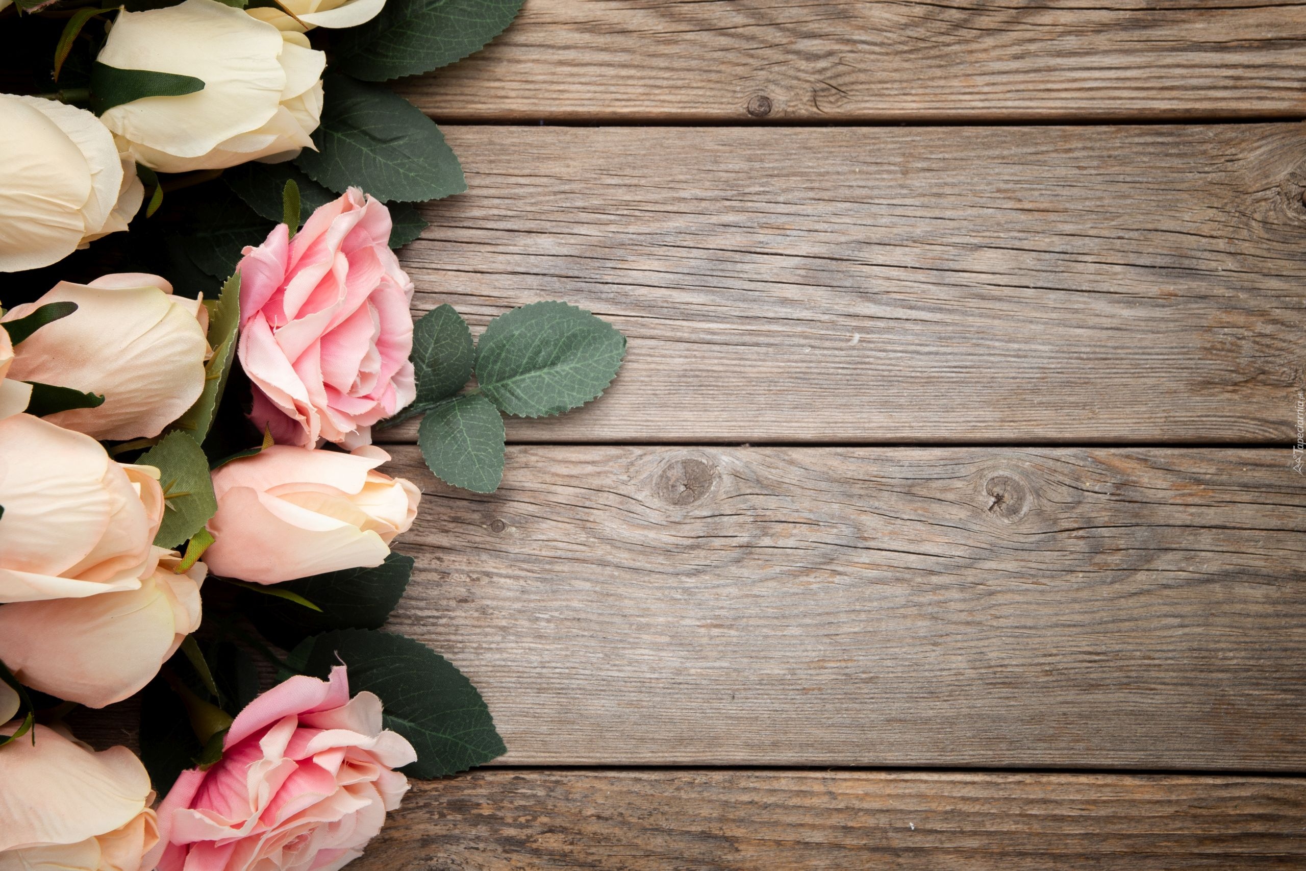 Edytor tapety: Różowe i kremowe róże na deskach