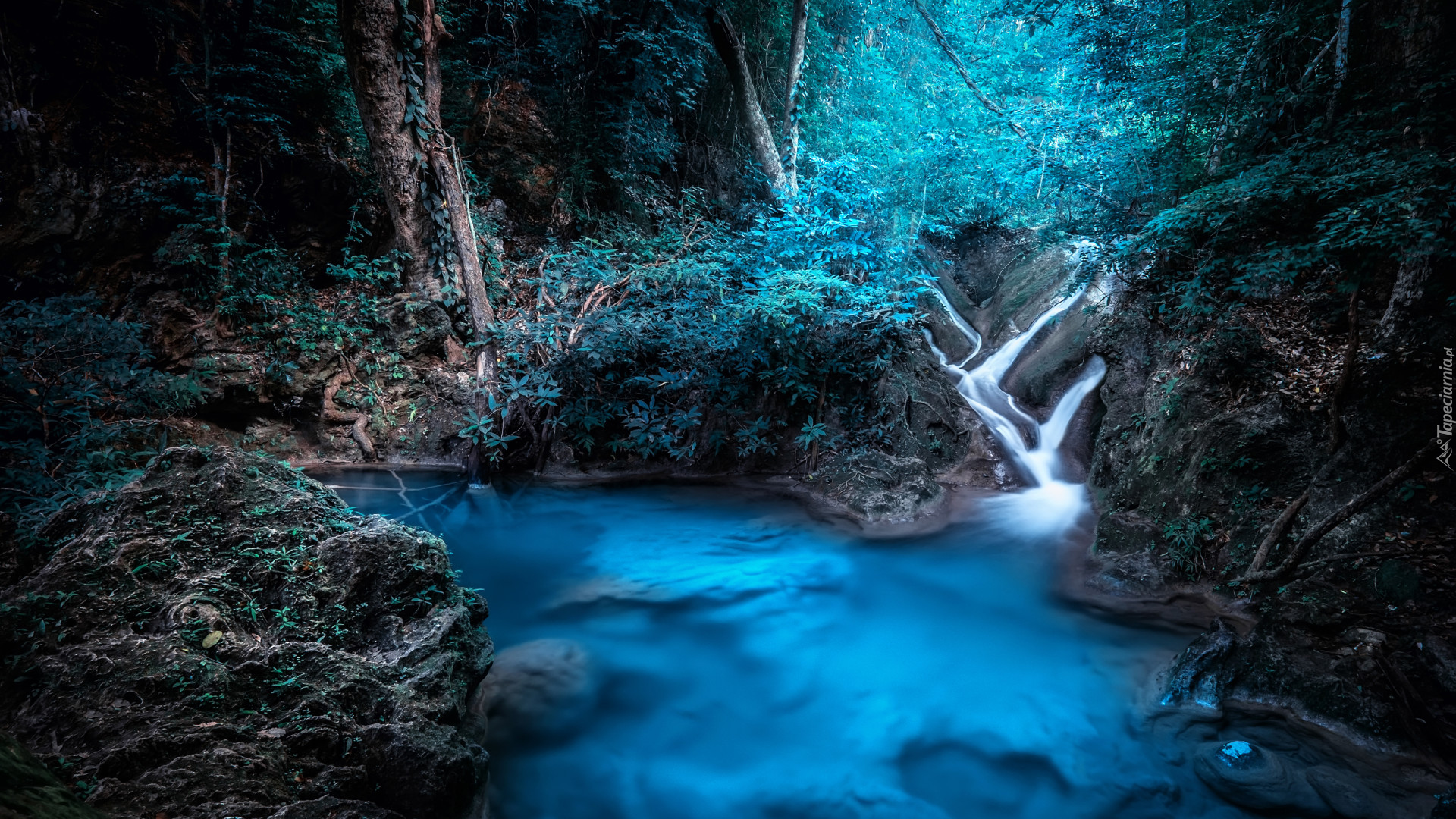 Edytor tapety: Rozjaśnione słońcem drzewa nad leśnym strumieniem