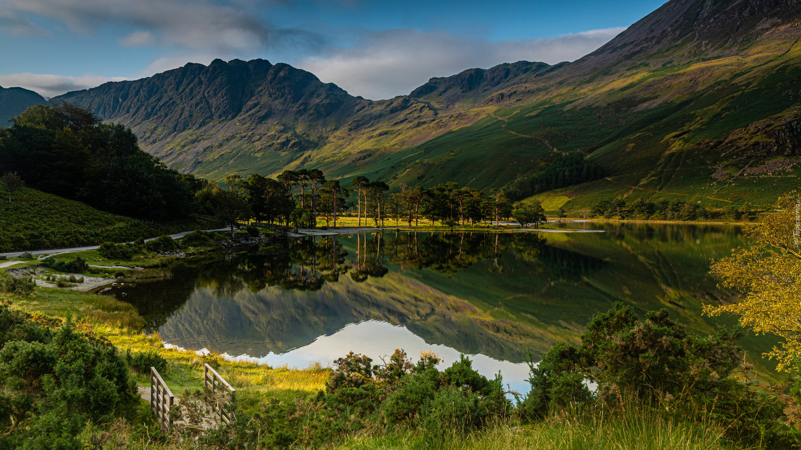 Edytor tapety: Zielone drzewa nad jeziorem na tle gór