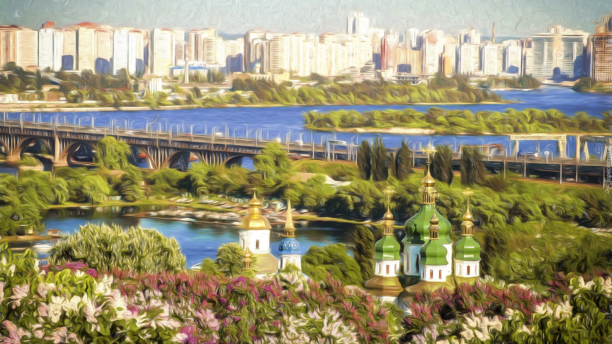 Edytor tapety: Domy i cerkiew nad rzeką w grafice