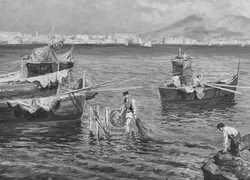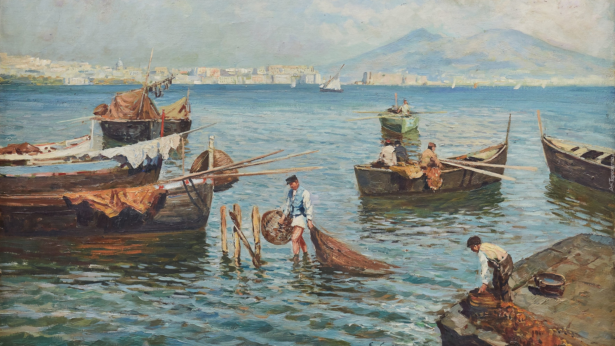 Edytor tapety: Rybacy przy łódkach w malarstwie Emmanuela Costa