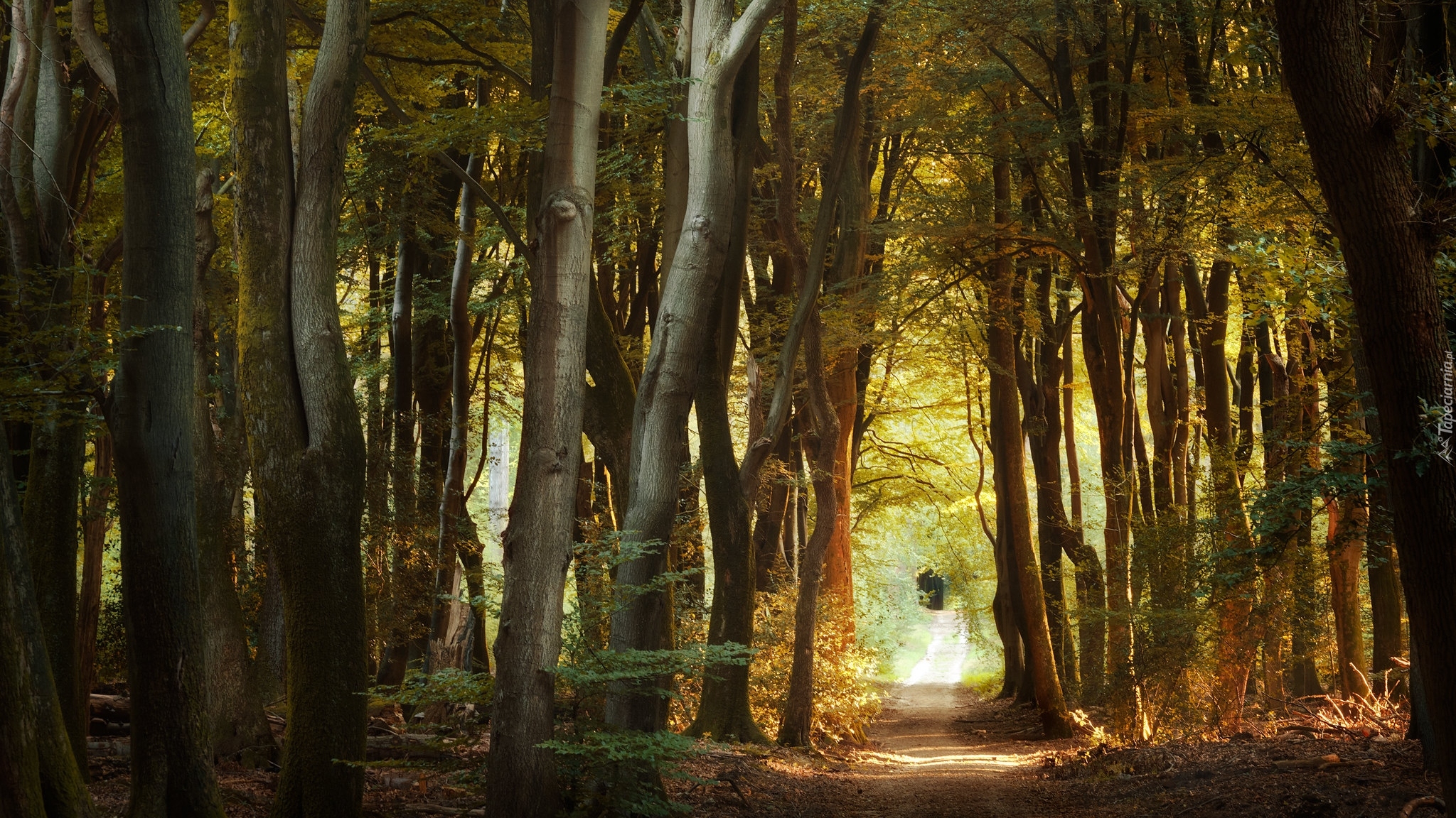 Edytor tapety: Rozświetlona droga pomiędzy drzewami