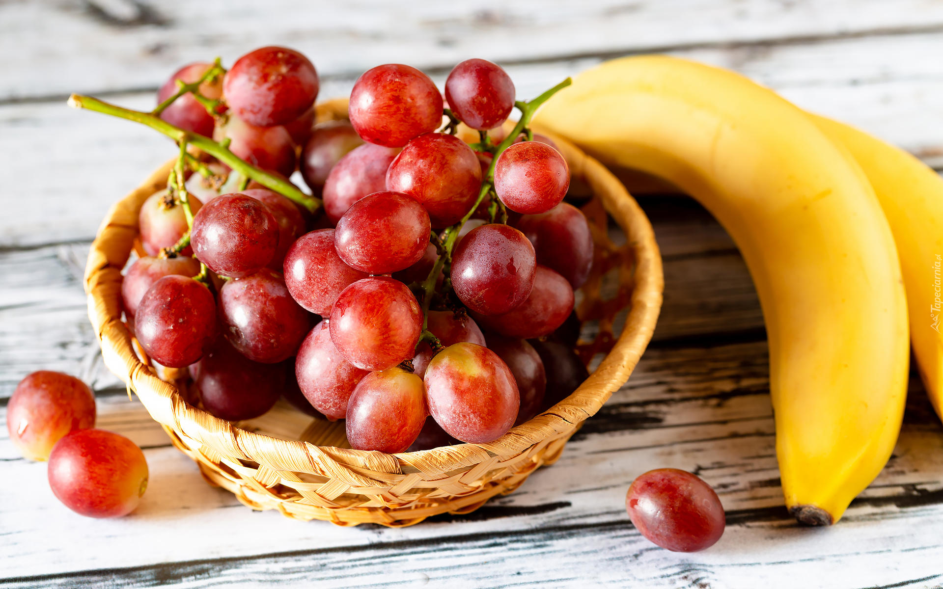 Edytor tapety: Banany obok winogron w koszyku