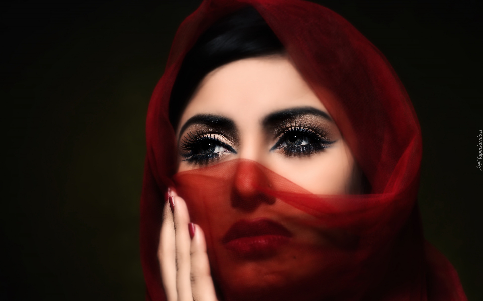 Edytor tapety: Twarz kobiety przysłonięta czerwoną chustą