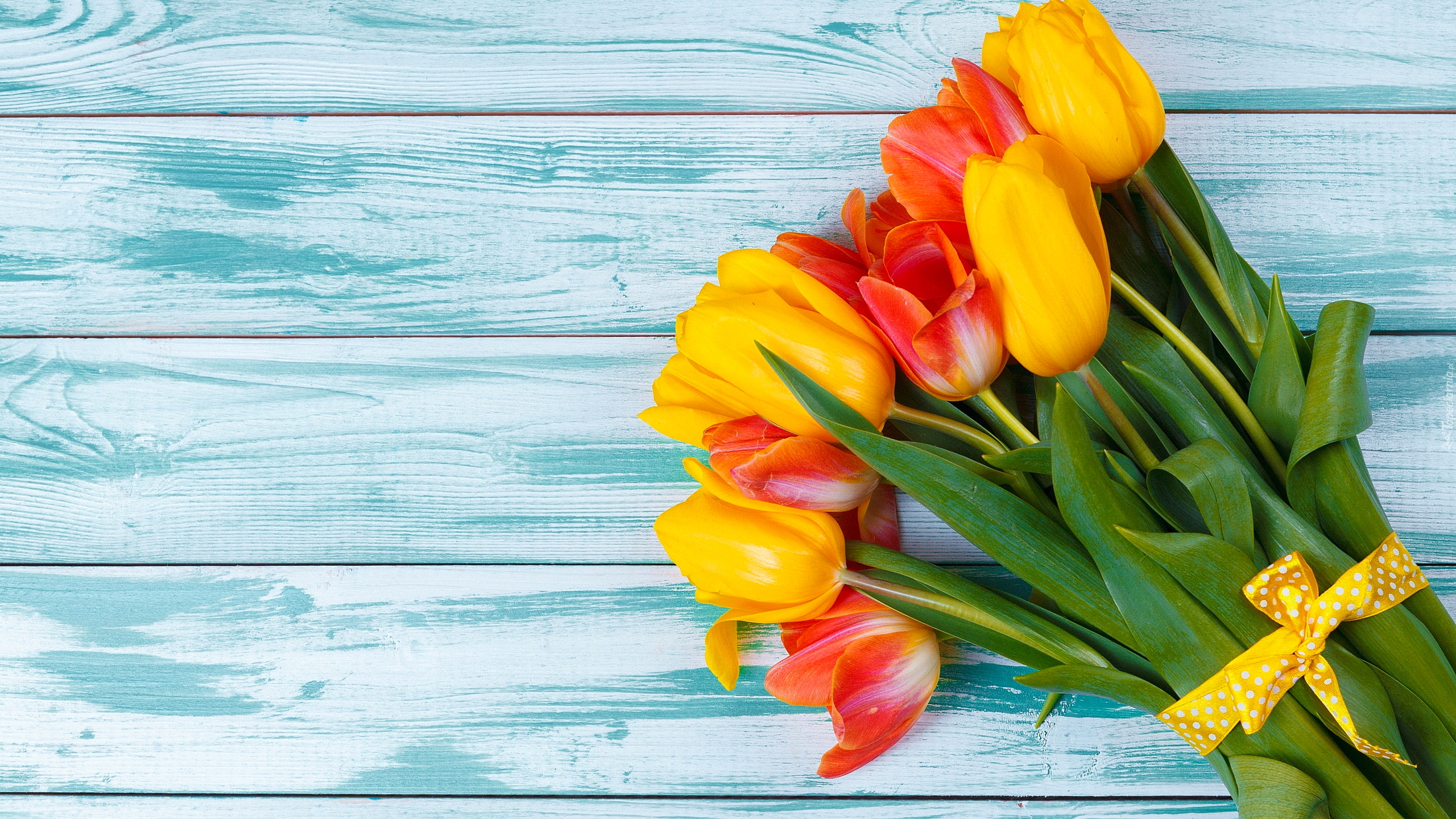 Edytor tapety: Bukiet tulipanów ze wstążką na deskach