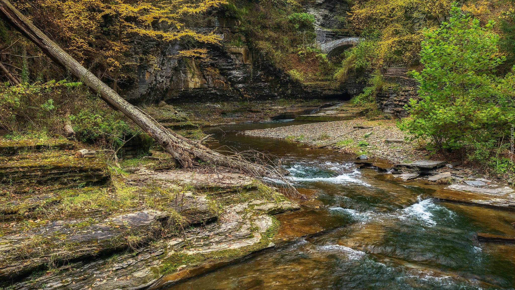 Edytor tapety: Powalone drzewo przy leśnej rzece