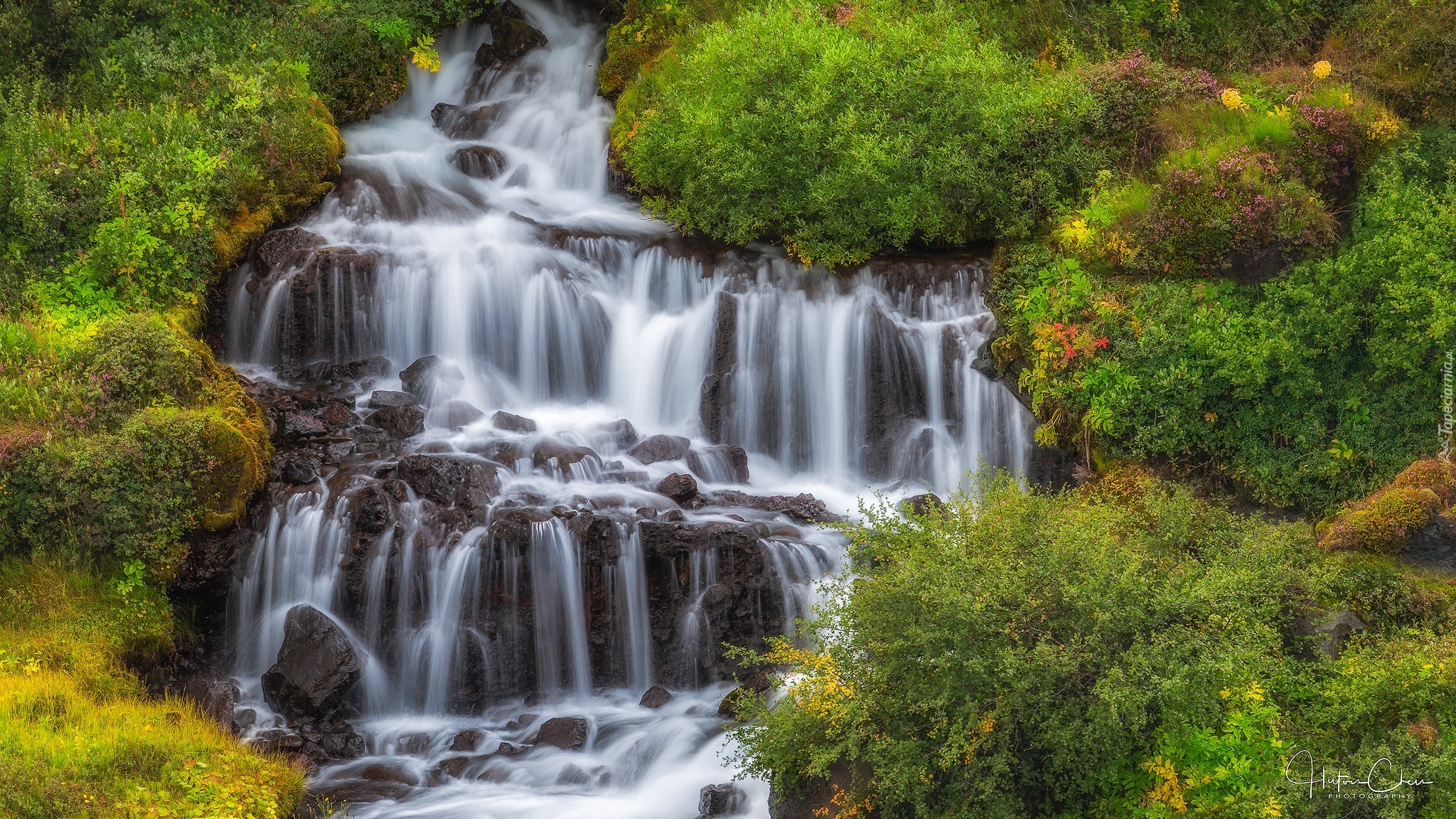 Edytor tapety: Wodospad na skale pośród zielonych krzewów