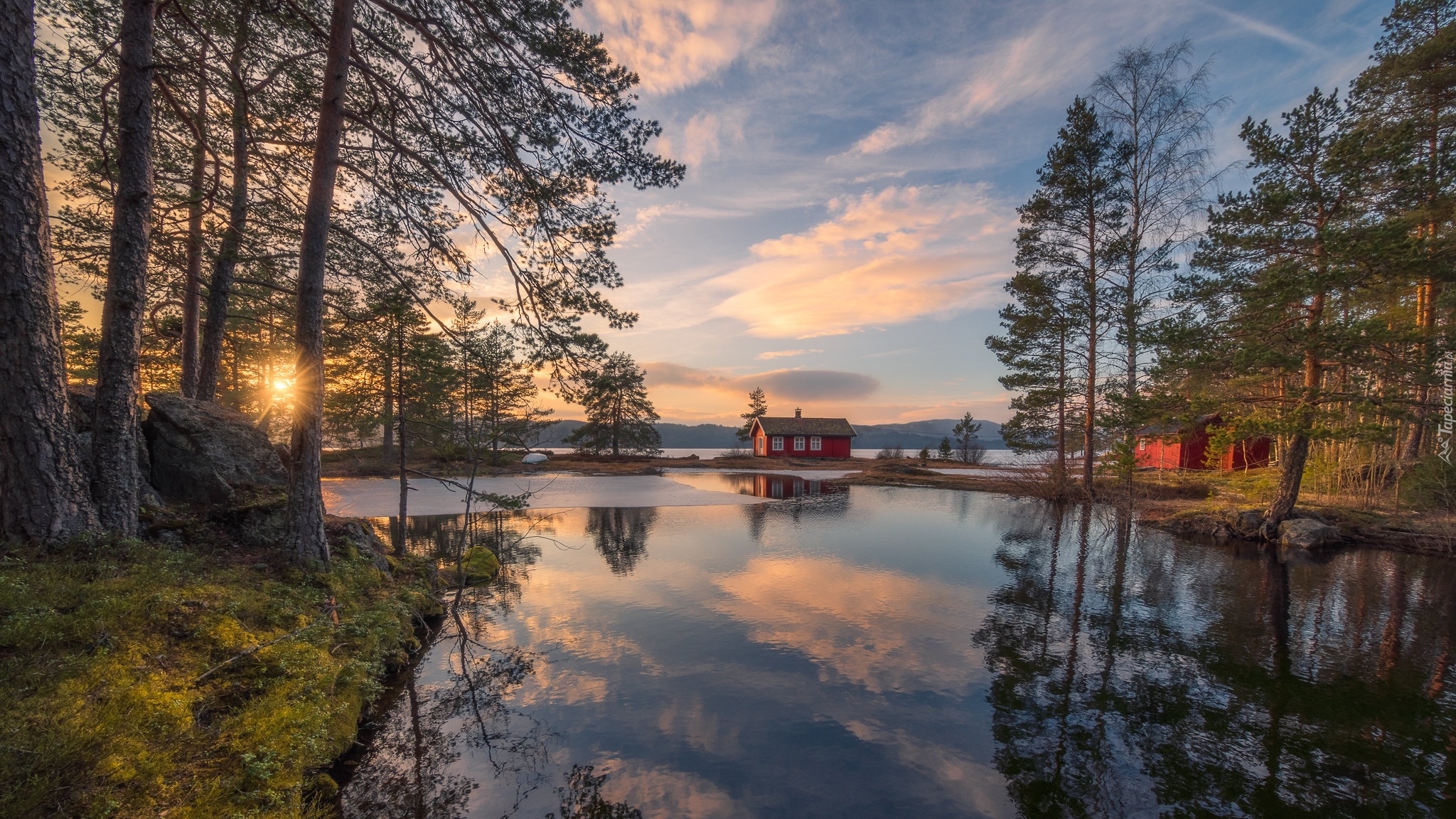 Edytor tapety: Czerwone domy nad jeziorem Vaeleren w promieniach słońca