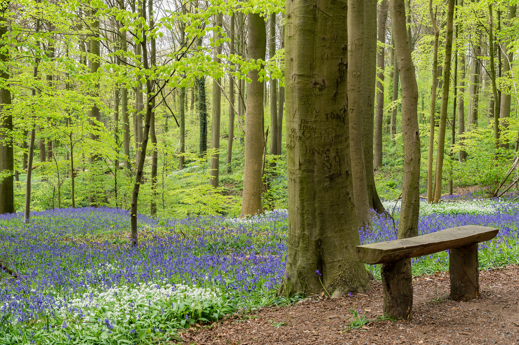 Edytor tapety: Ławeczka w wiosennym lesie