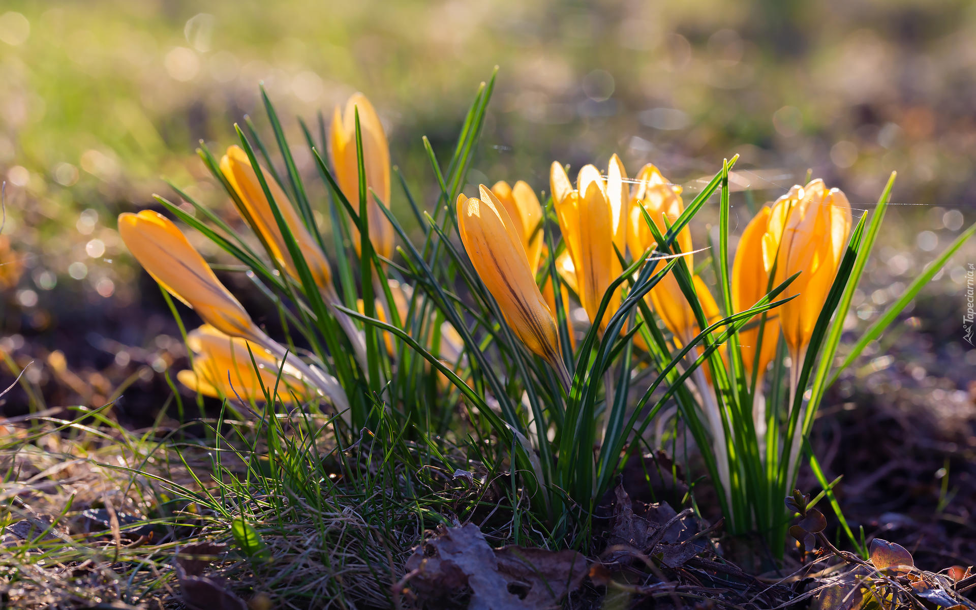 Edytor tapety: Rozświetlone kępki żółtych krokusów