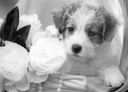 Edytor tapety: Szczeniak Jack Russel terrier w koszu z kwiatami