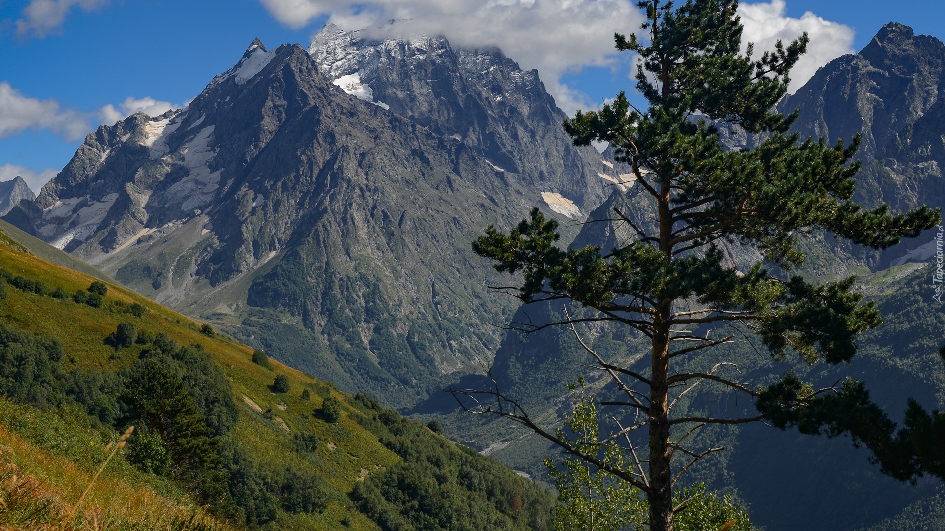 Edytor tapety: Drzewo na zboczu z widokiem na góry